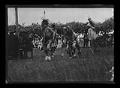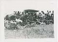 Title: Indians in dancing regalia seated on edge of dance grounds automobiles in background