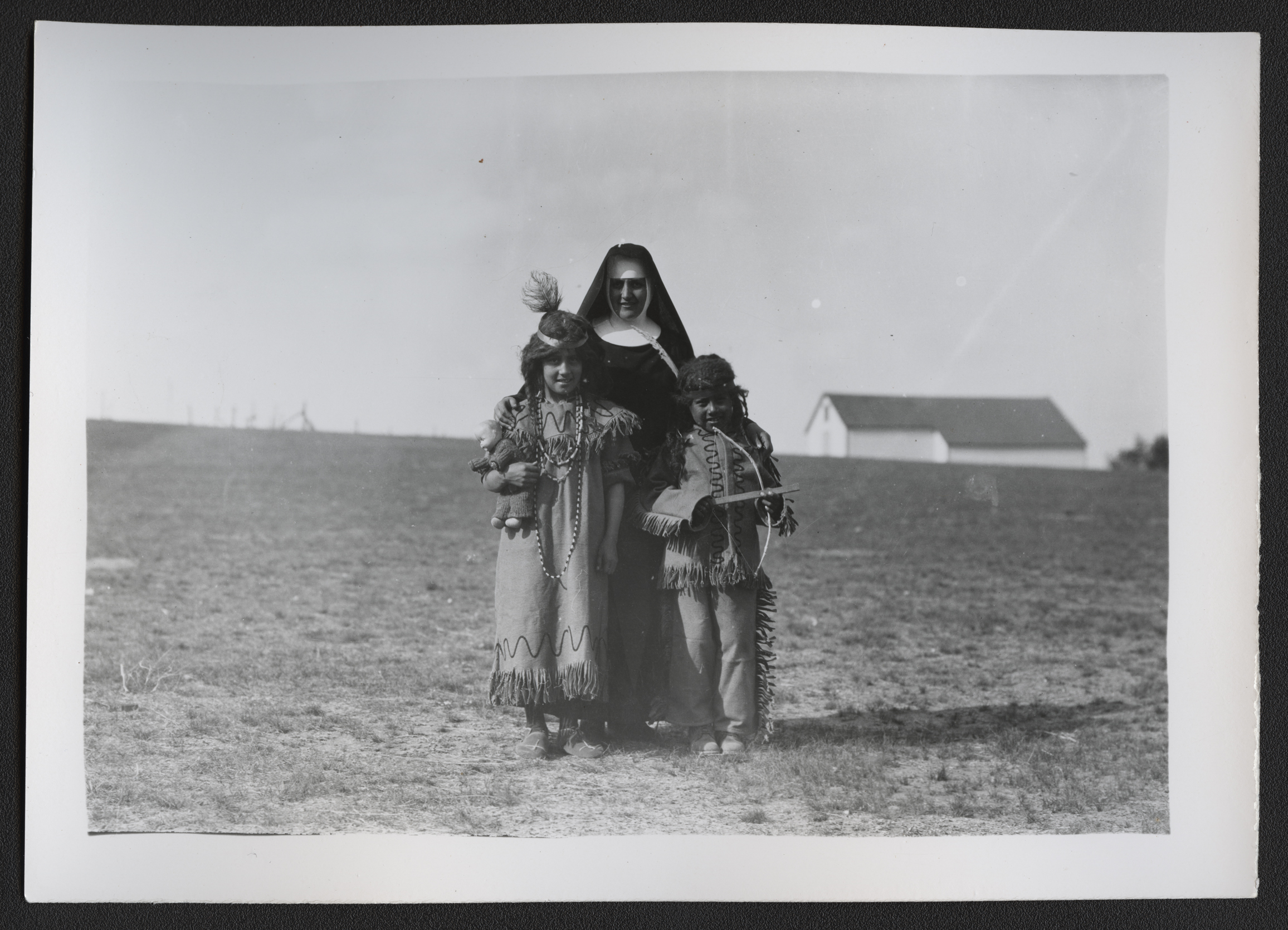 Title: Sister Seraphine with two children in Indian garb, Fort Yates (N.D.)