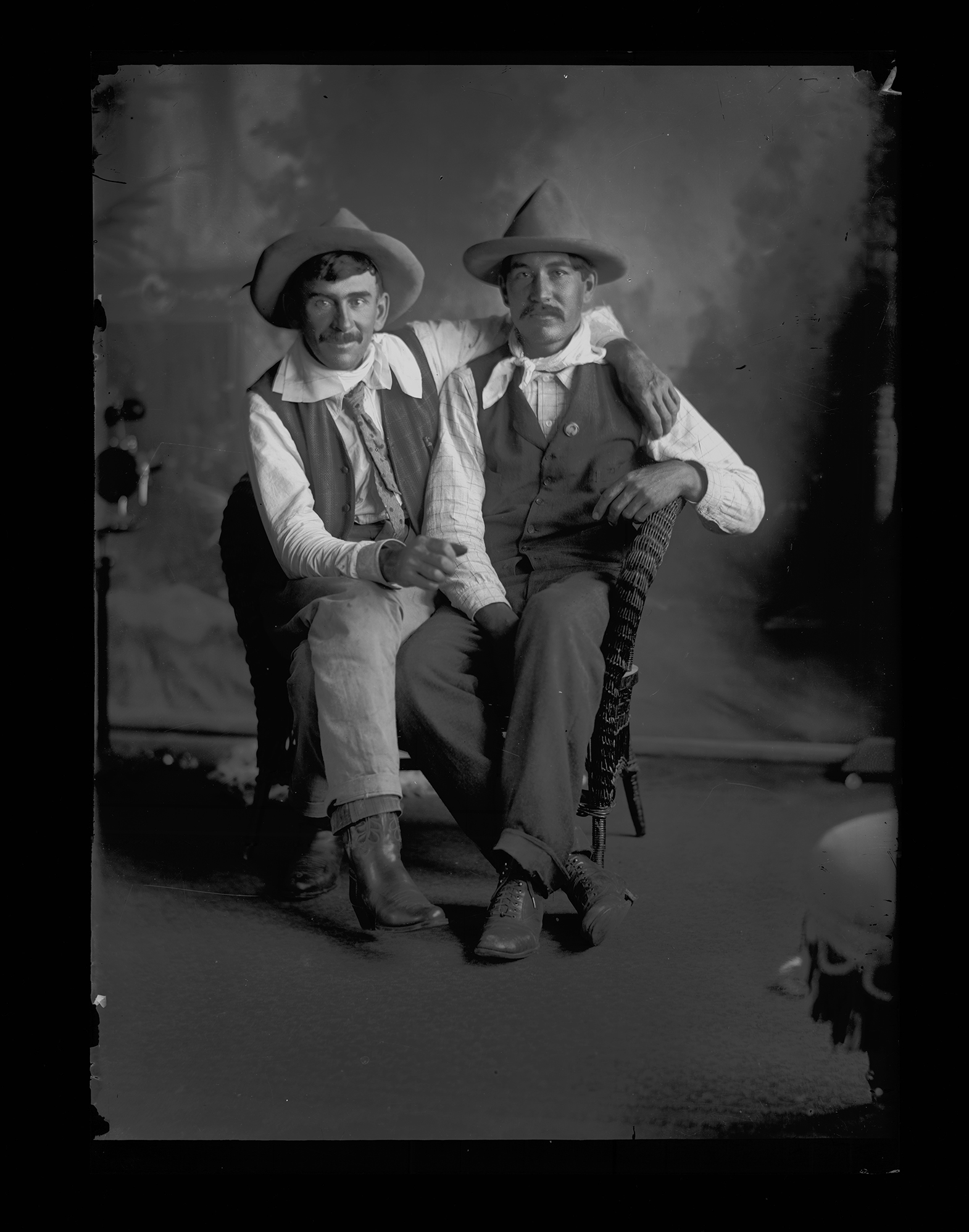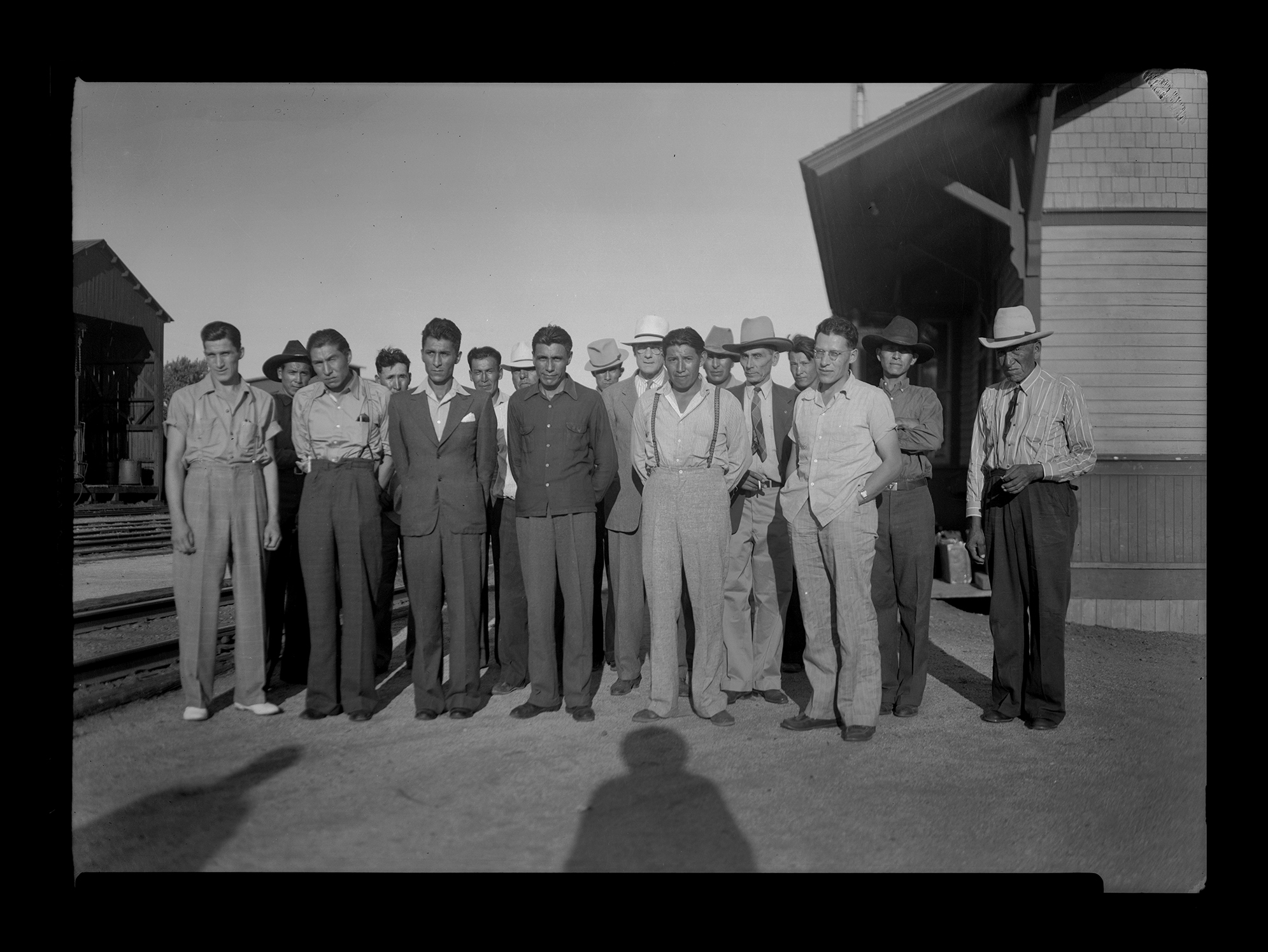 Title: Movie extras for "They Died with their boots on" pose on the train platform
