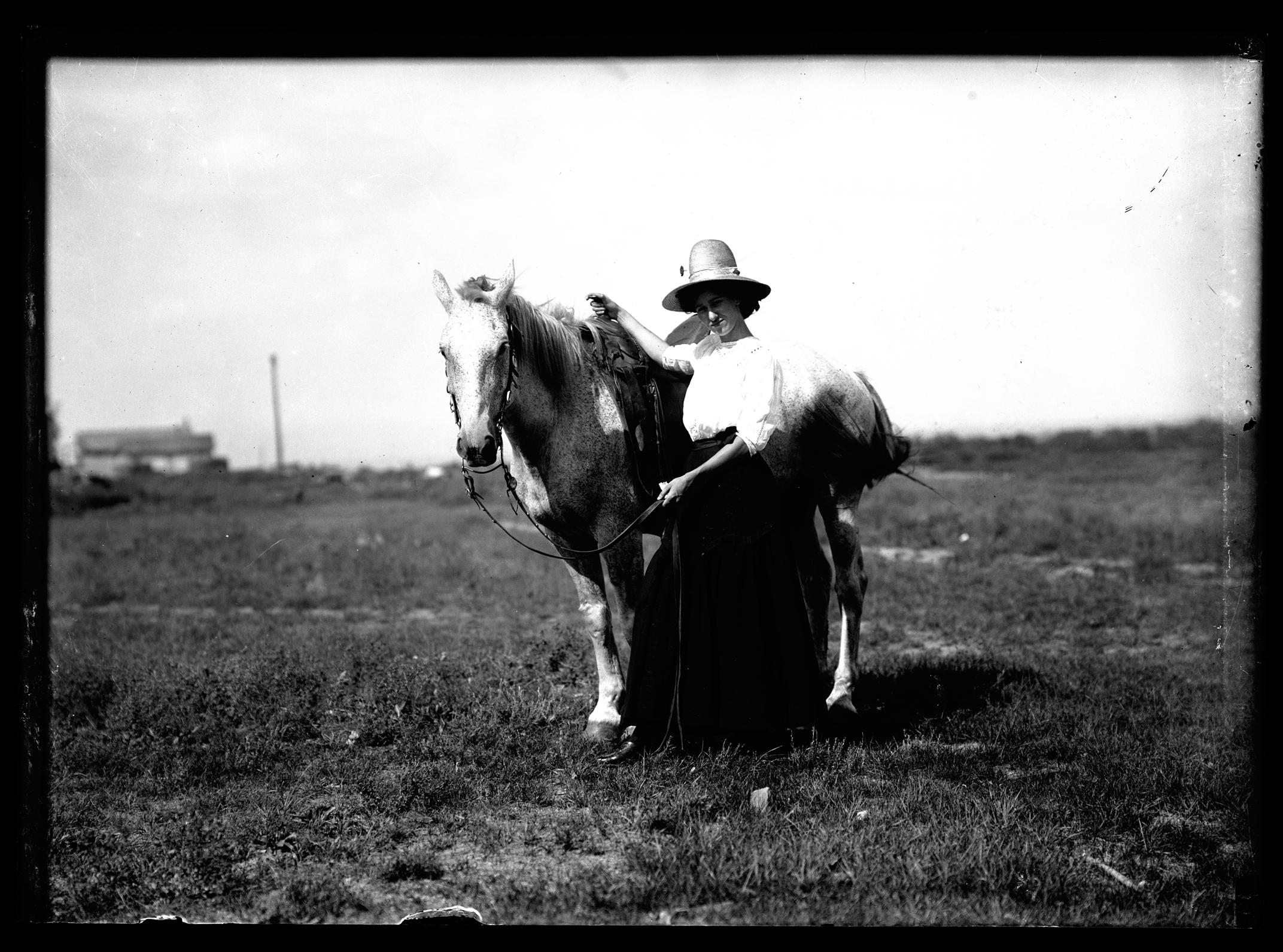Title: Lucille Van Solen standing beside a pony on the Parkin Ranch