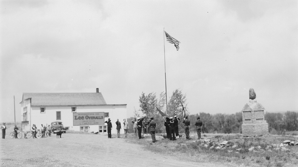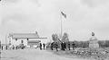 Title: Group by flagpole and the Standing Rock, Fort Yates (N.D.)