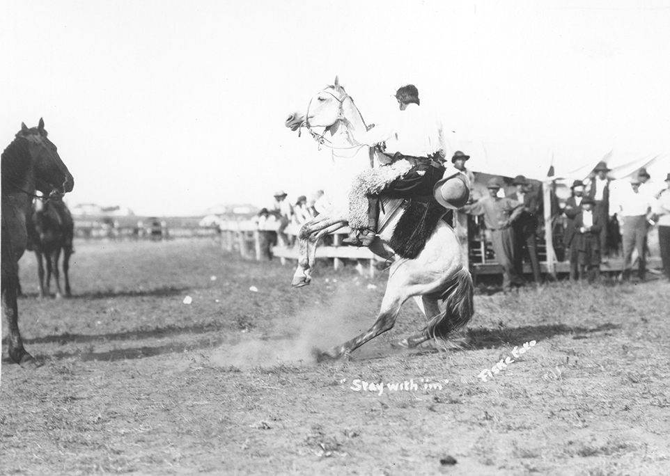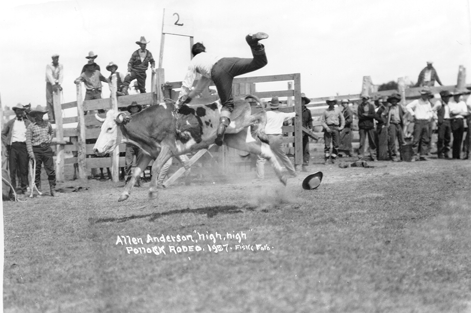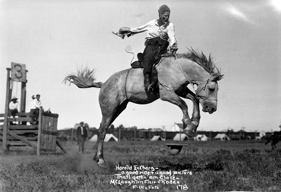 Title: "Harold Eckberg, a good ride and a good picture, that's gettin' 'em close McLaughlin Fair Rodeo"