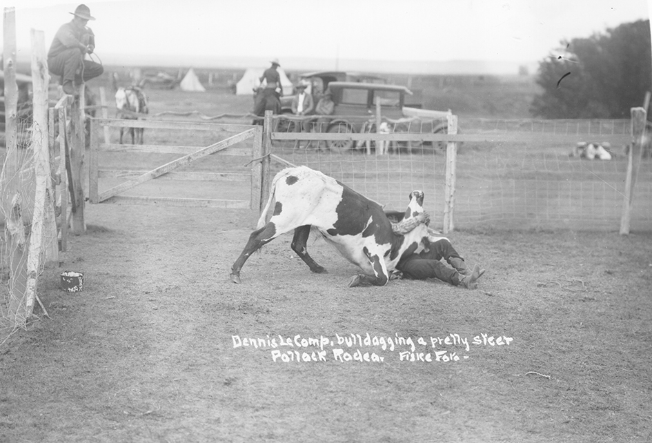 Title: Dennis LeCompte bulldogging a pretty steer at the rodeo, Pollock (S.D.)