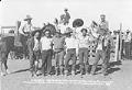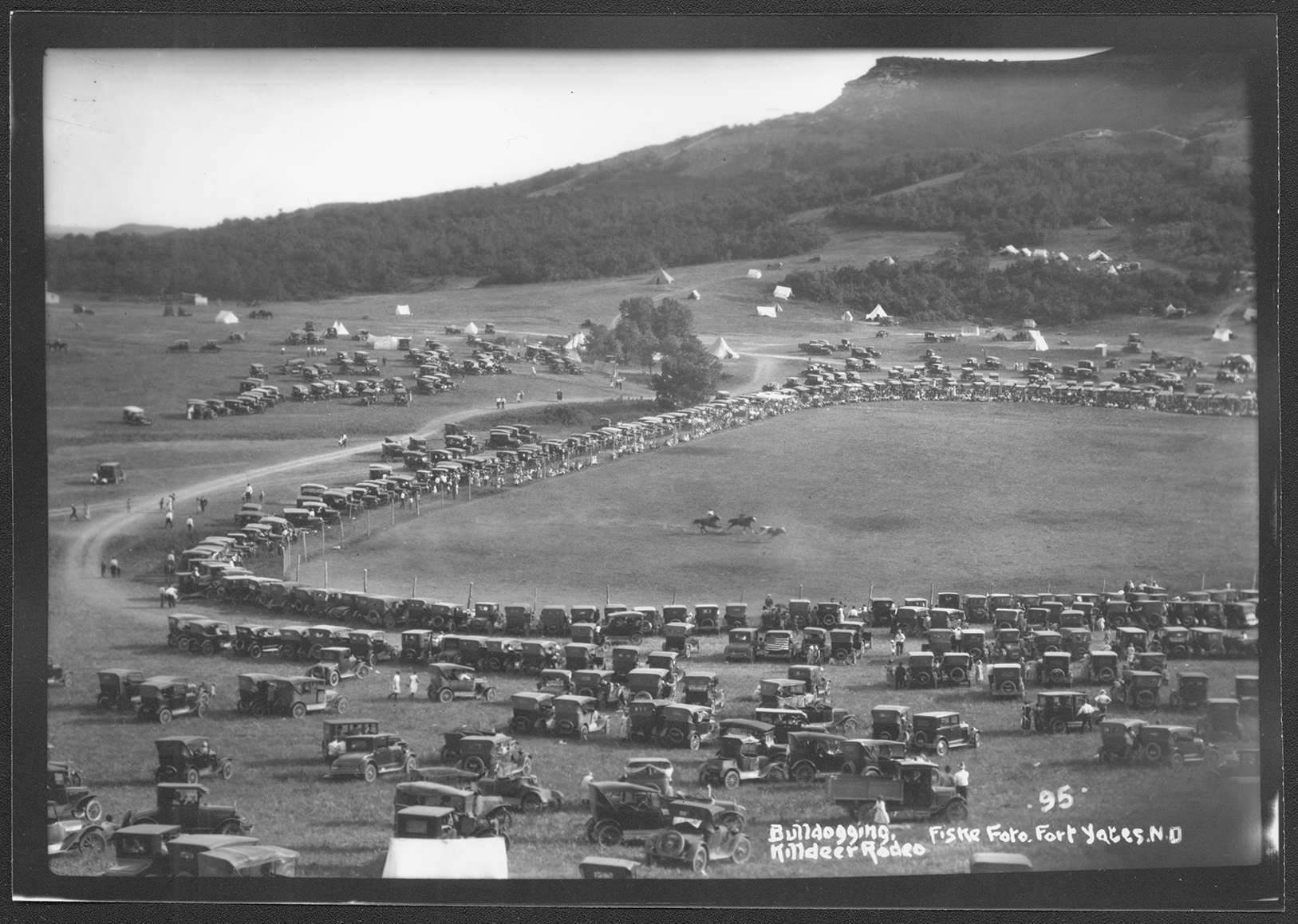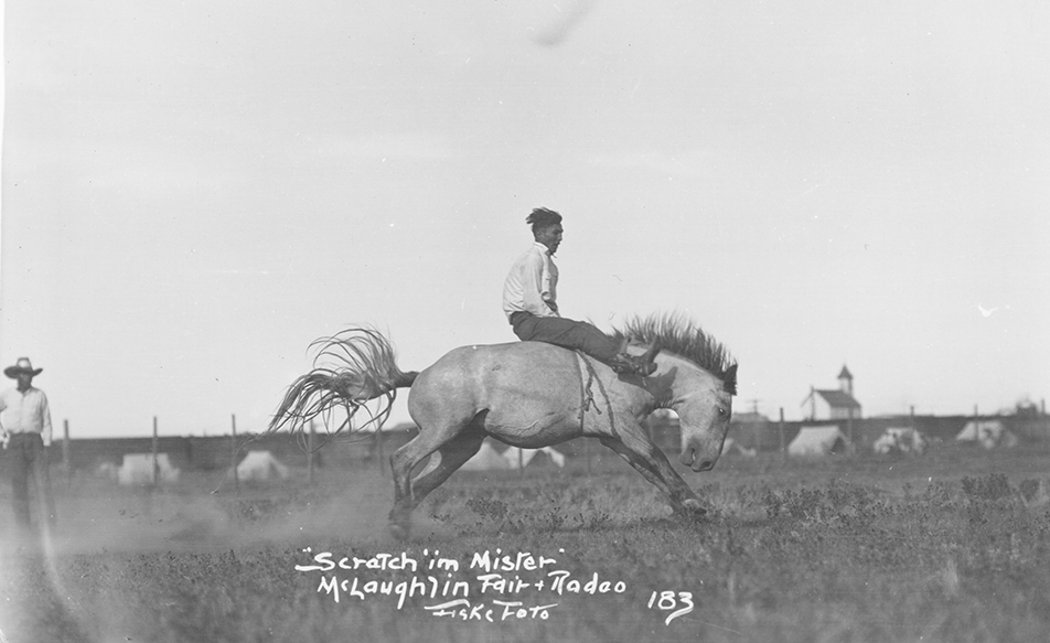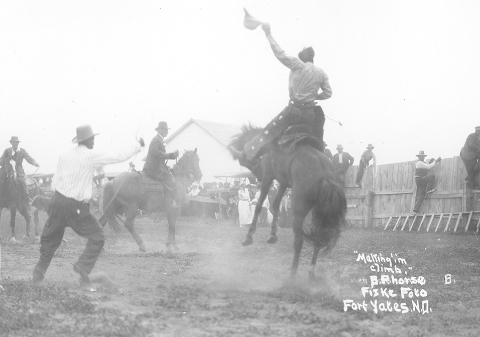 Title: "Making 'im climb B. P. horse," Fort Yates Rodeo