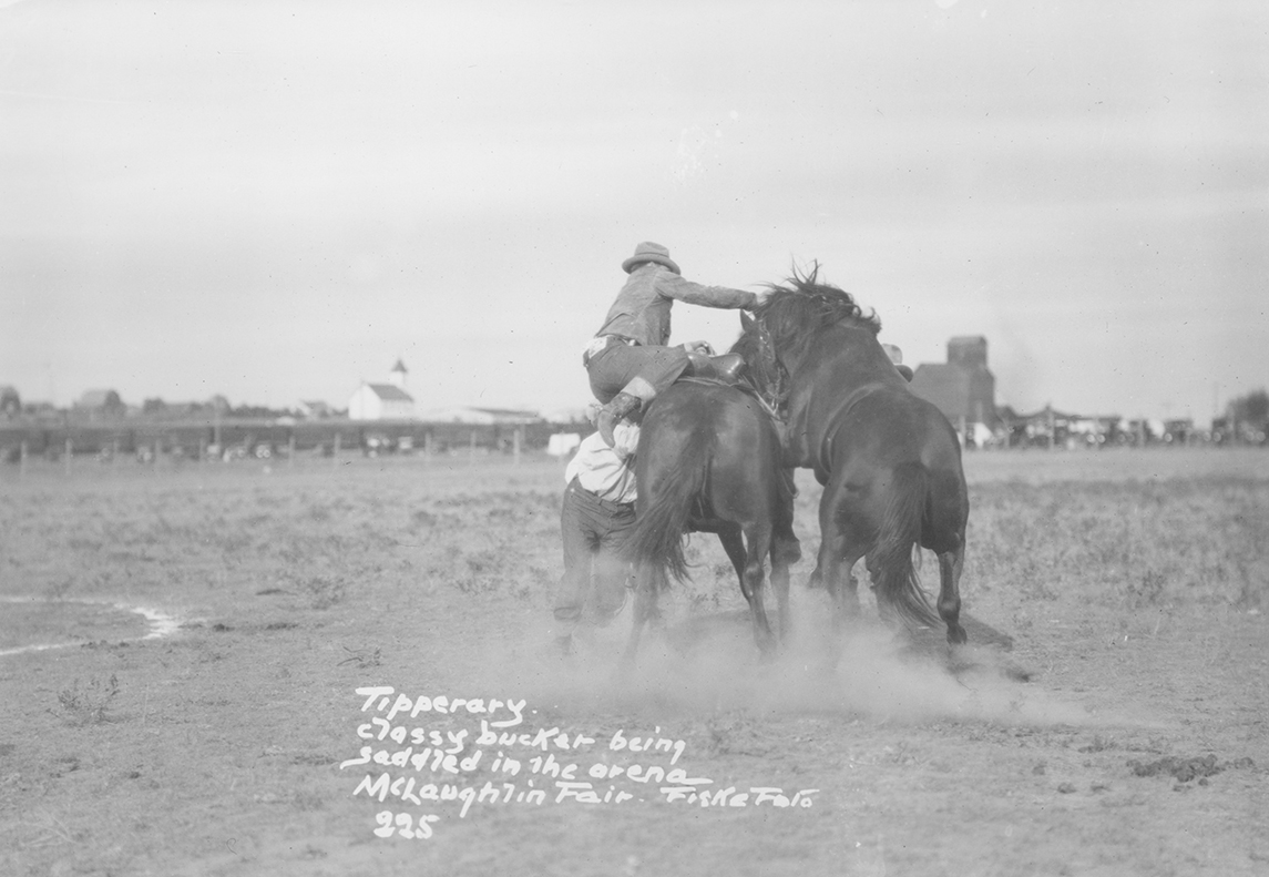 Title: "Tipperary, classy bucker, being saddled in the arena, McLaughlin Fair"
