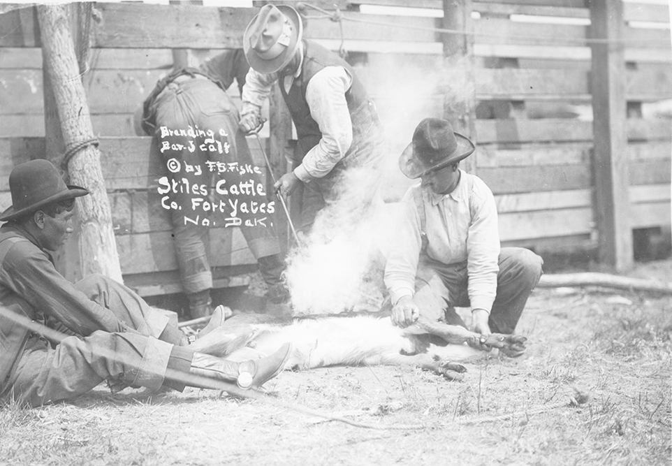 Title: Branding a Bar J calf, Stiles Cattle Co., Fort Yates (N.D.)
