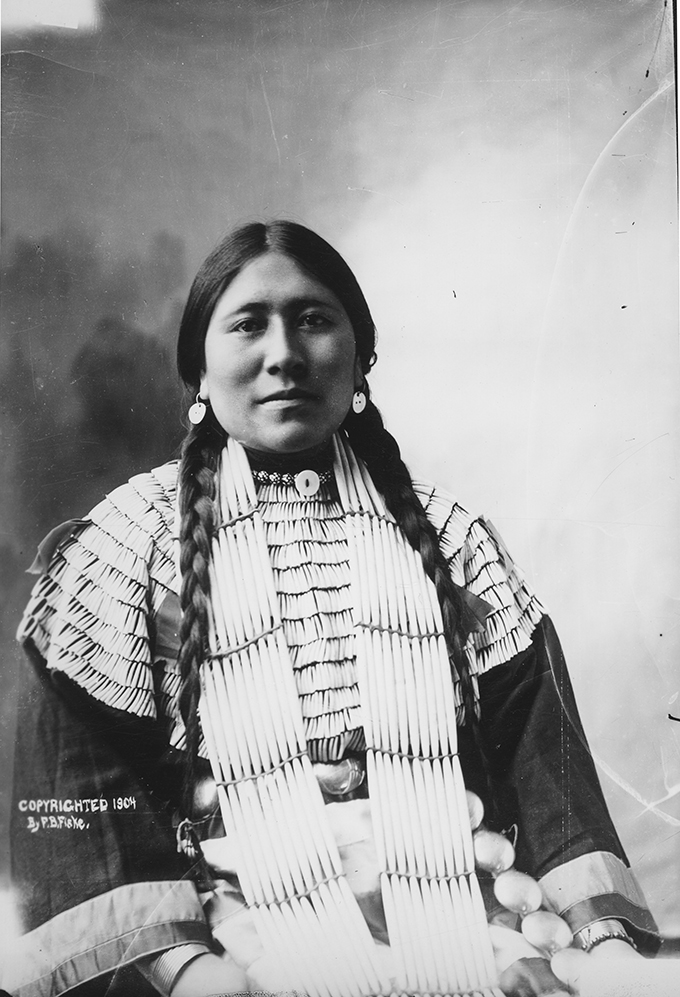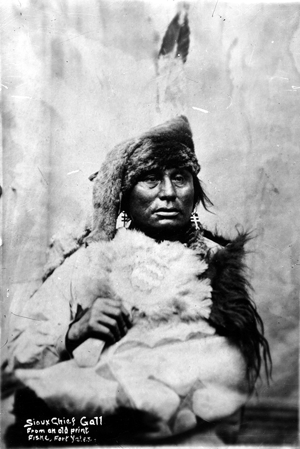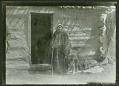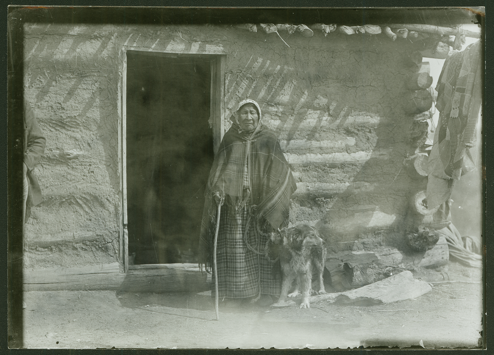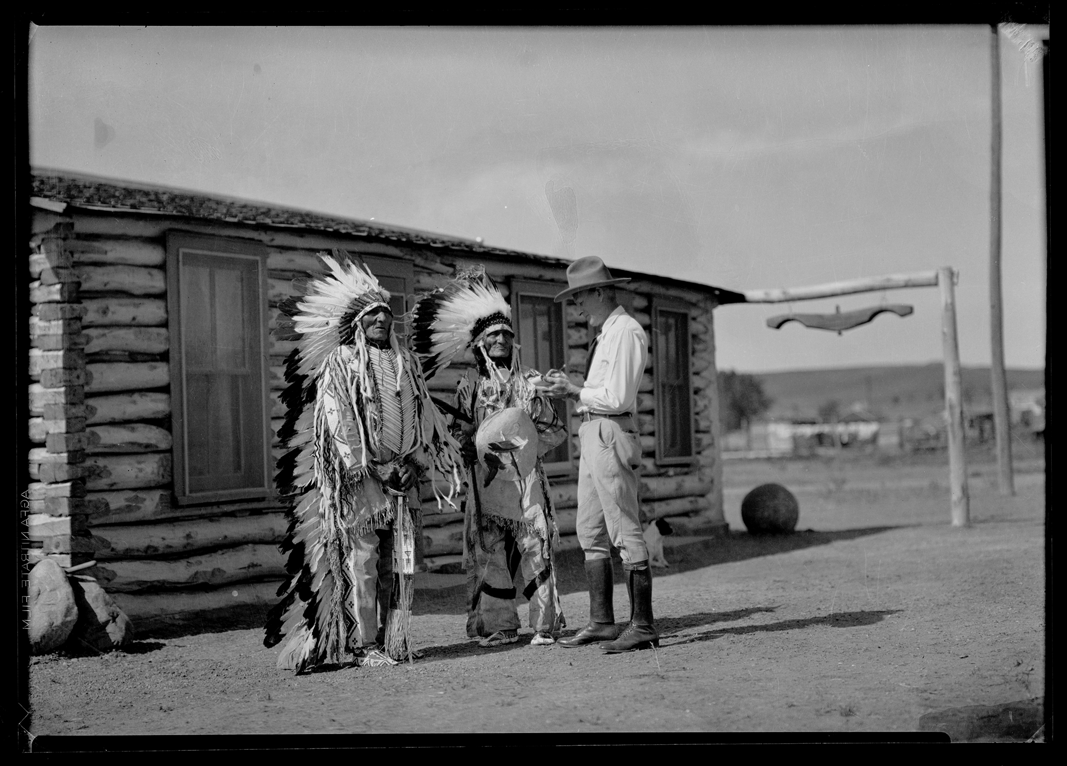 Title: White Bull, One Bull and Frank Fiske outside a log building
