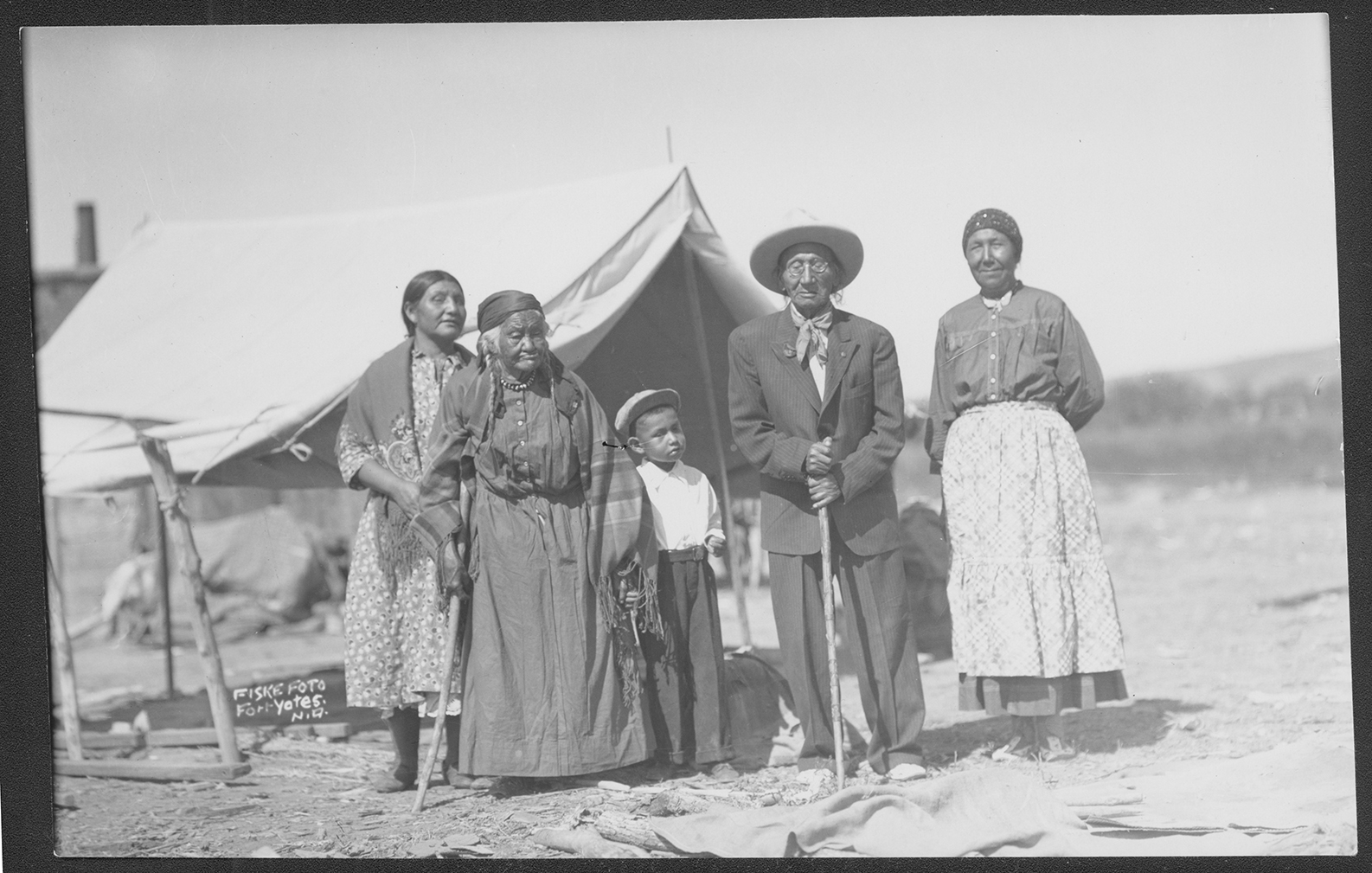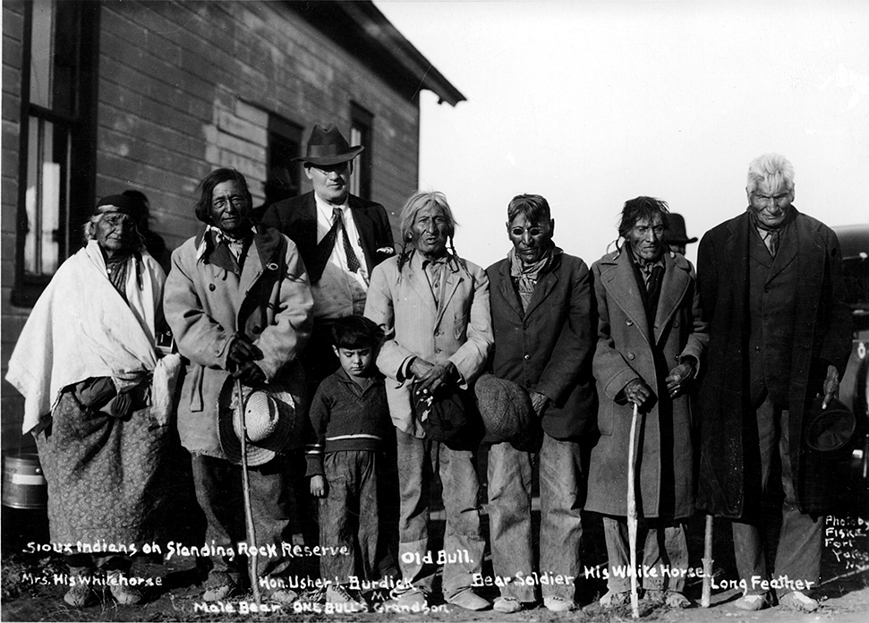 Title: Mrs. His Whitehorse, Usher Burdick, Old Bull, Bear Soldier, His White Horse, Long Feather and Male Bear, Fort Yates (N.D.)
