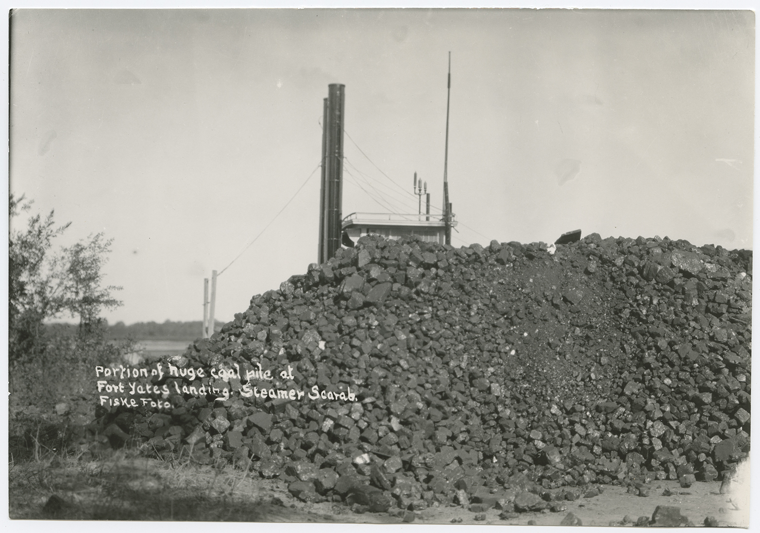 Title: "Portion of huge coal pile at Fort Yates landing. Steamer Scarab"