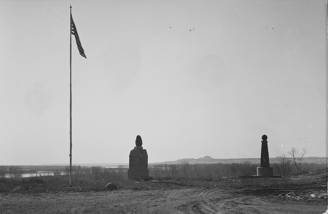 Title: The flag and Standing Rock looking toward Missouri River and Ghost Butte, Fort Yates (N.D.)