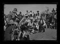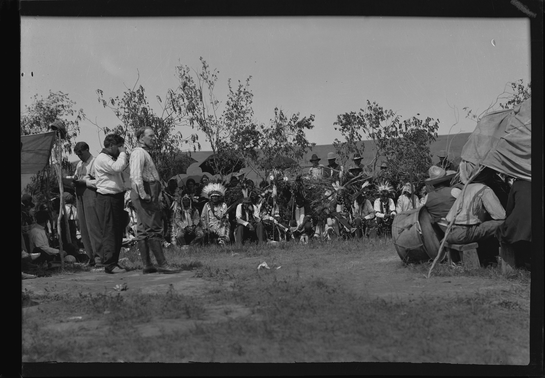 Title: Indians in regalia talking in group with crowd behind them