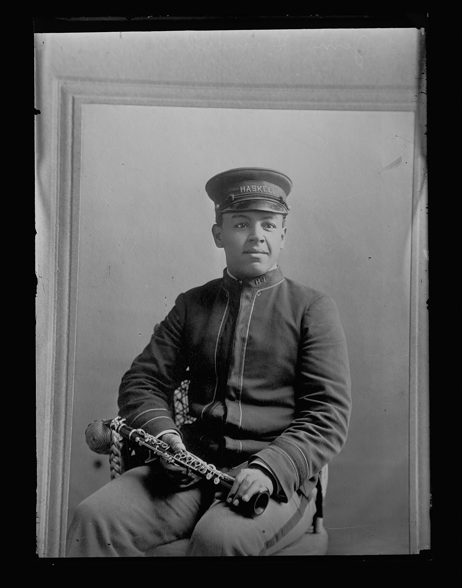 Title: James Howard in band uniform with clarinet as student at Haskell Institute