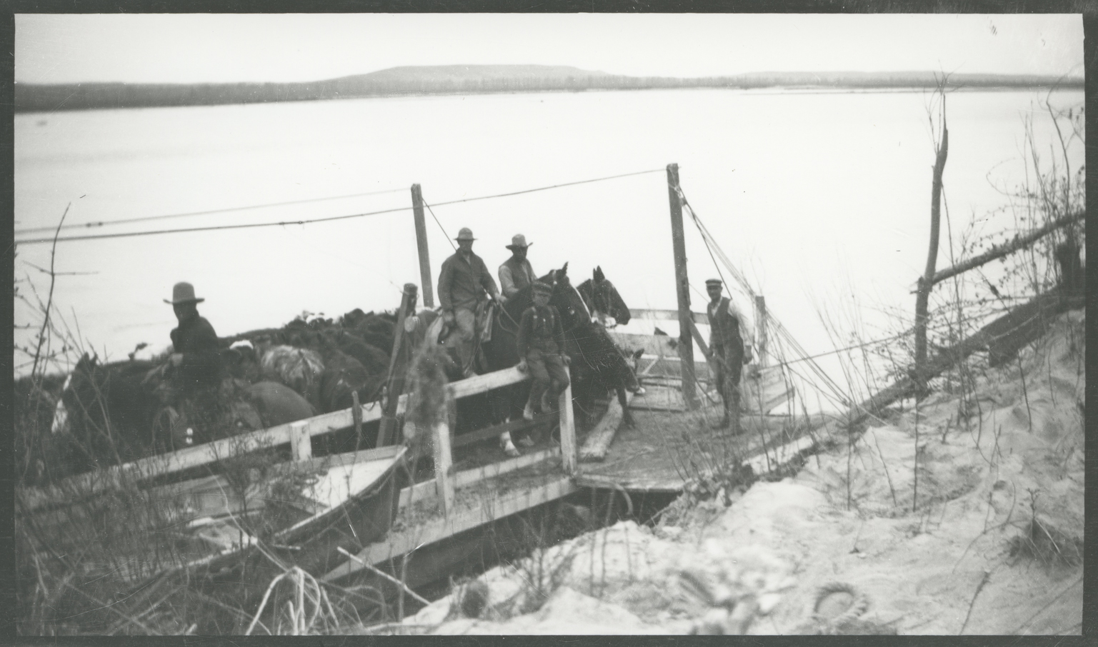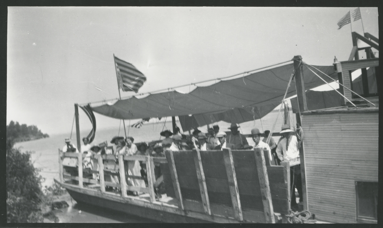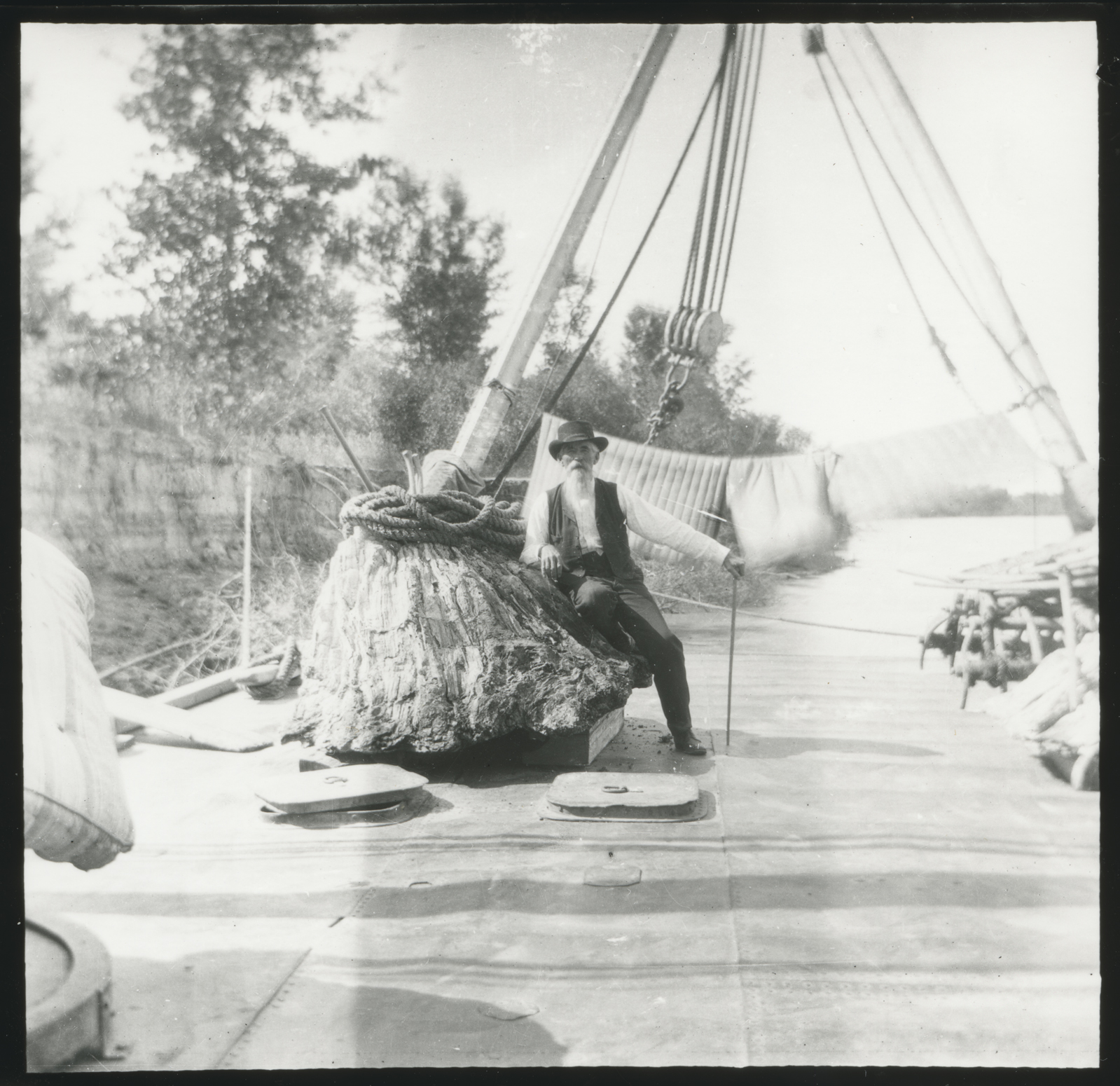 Title: Captain J. M. Belk with petrified tree trunk aboard snag boat Mandan
