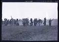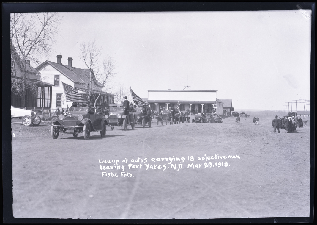Title: "Lineup of autos carrying 18 selective men leaving Fort Yates N.D."