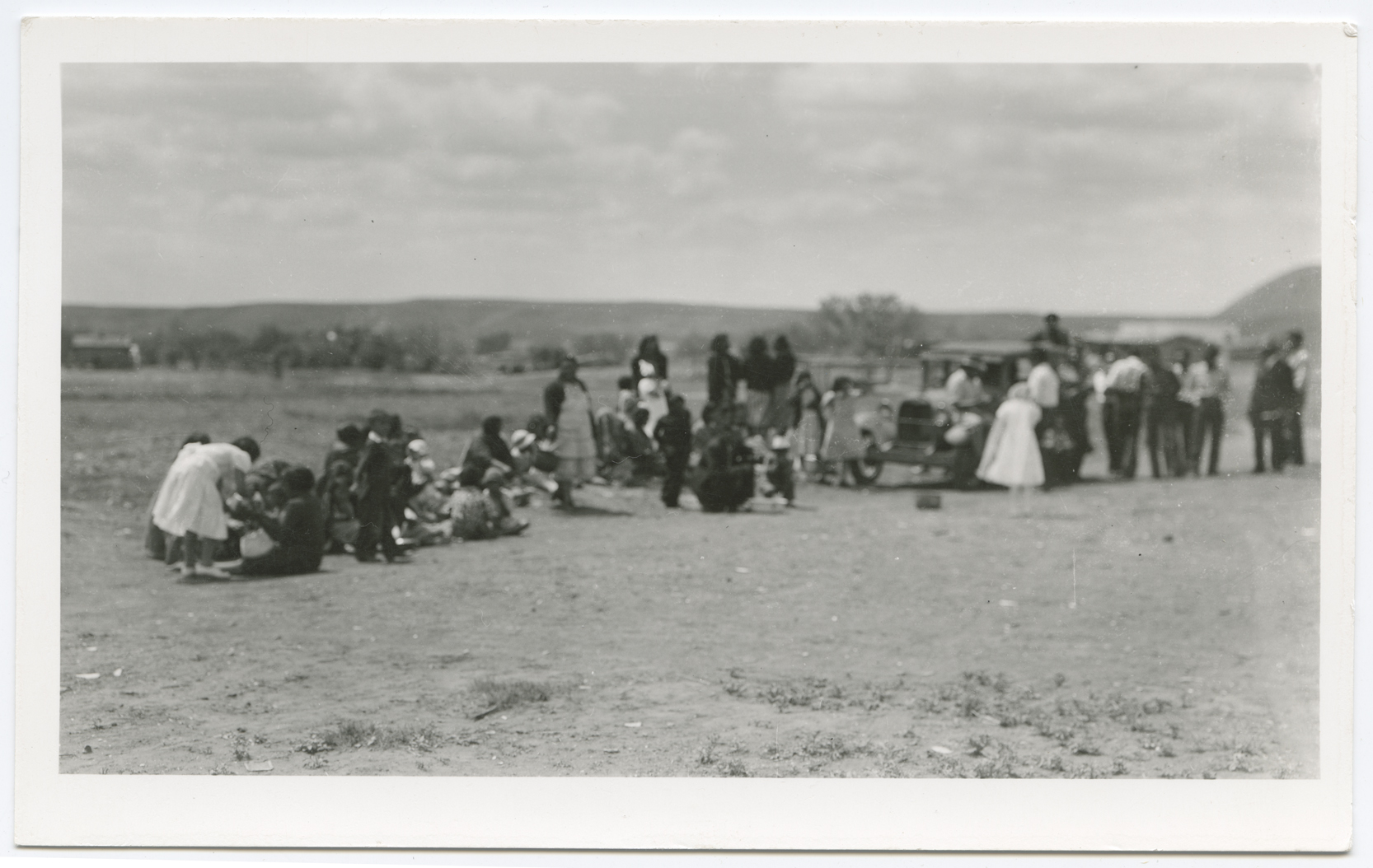 Title: Indian women and children seated along roadway, men visiting around car