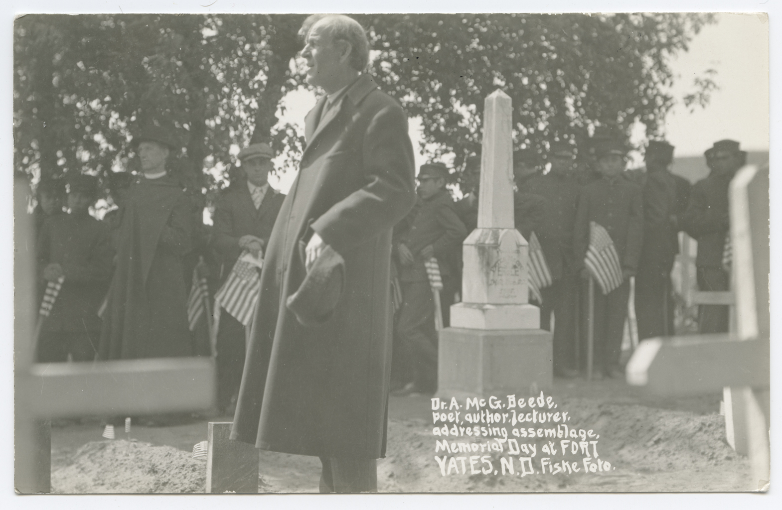 Title: "Dr. A. McG. Beede, poet, author, lecturer addressing assemblage, Memorial Day, Fort Yates N.D."
