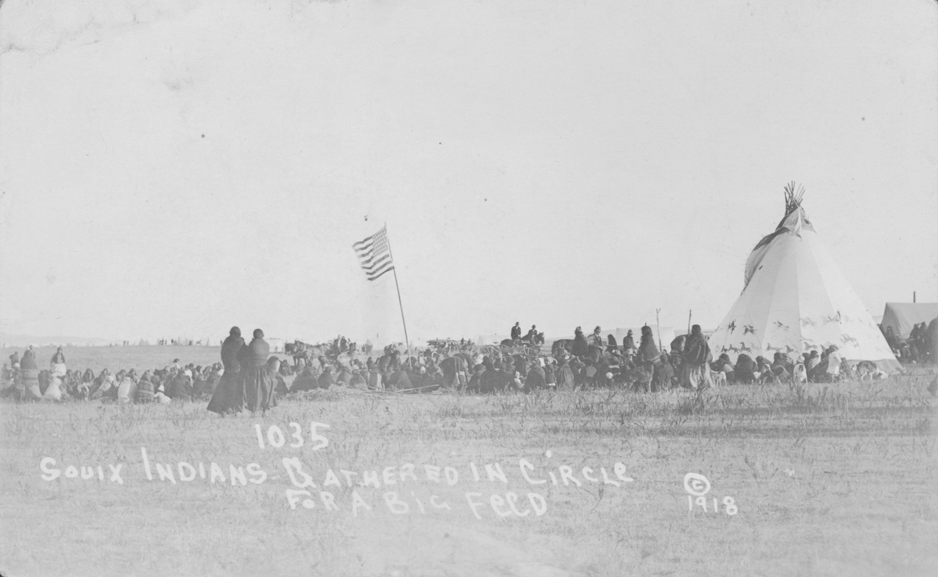 Title: Sioux Indians gathered in a circle for a big feed