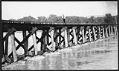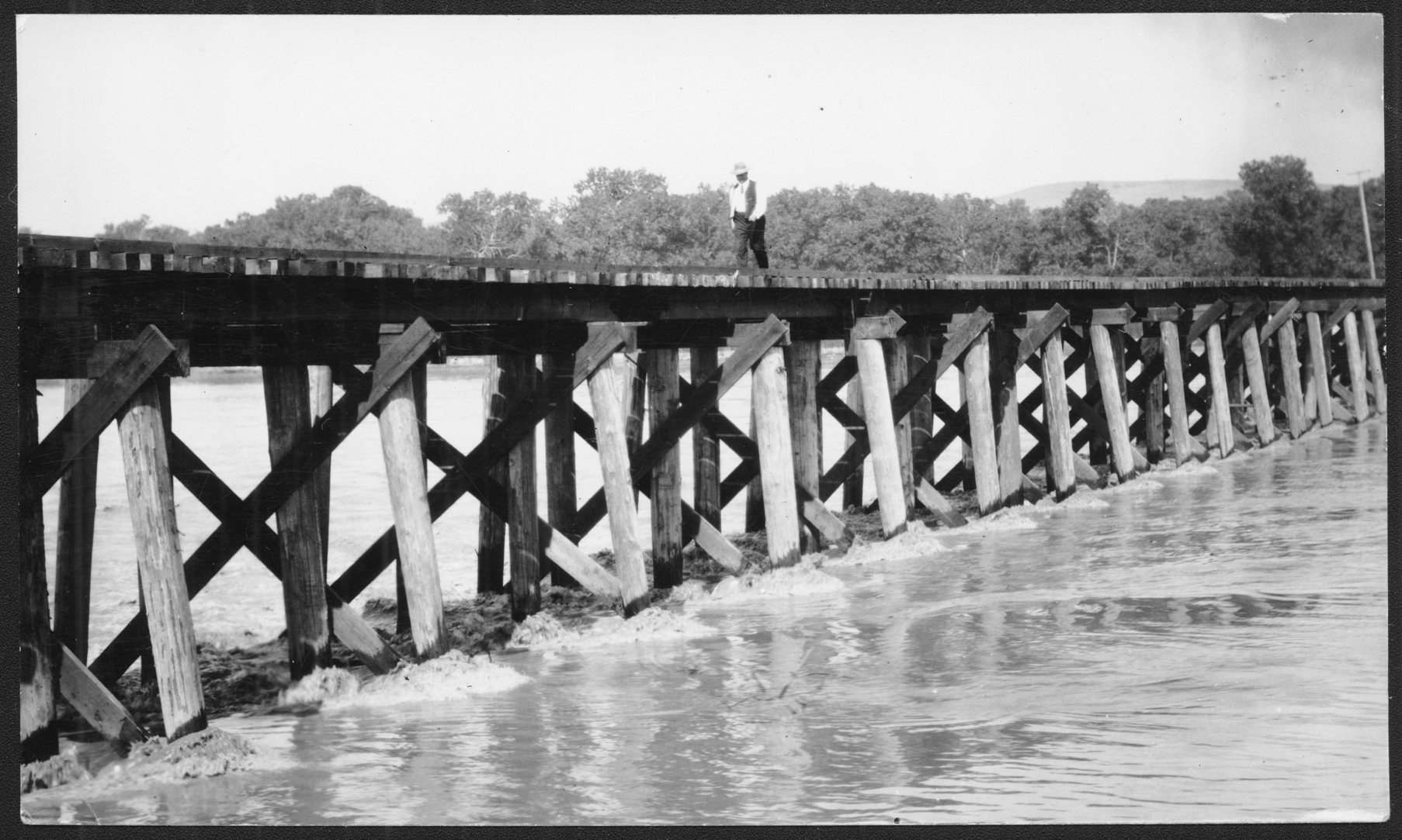 Title: Man walking on trestle over river