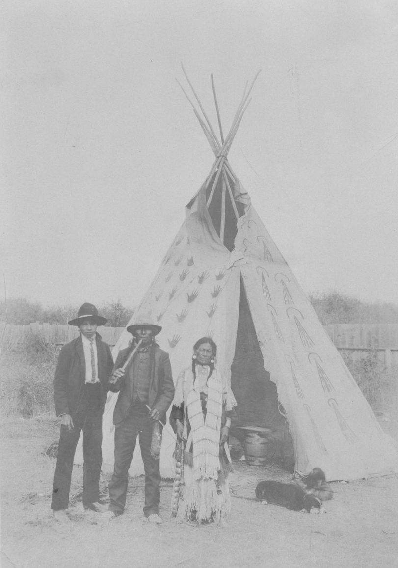 Title: Fool Bear and family pose in front of a painted tipi, Mandan (N.D.)