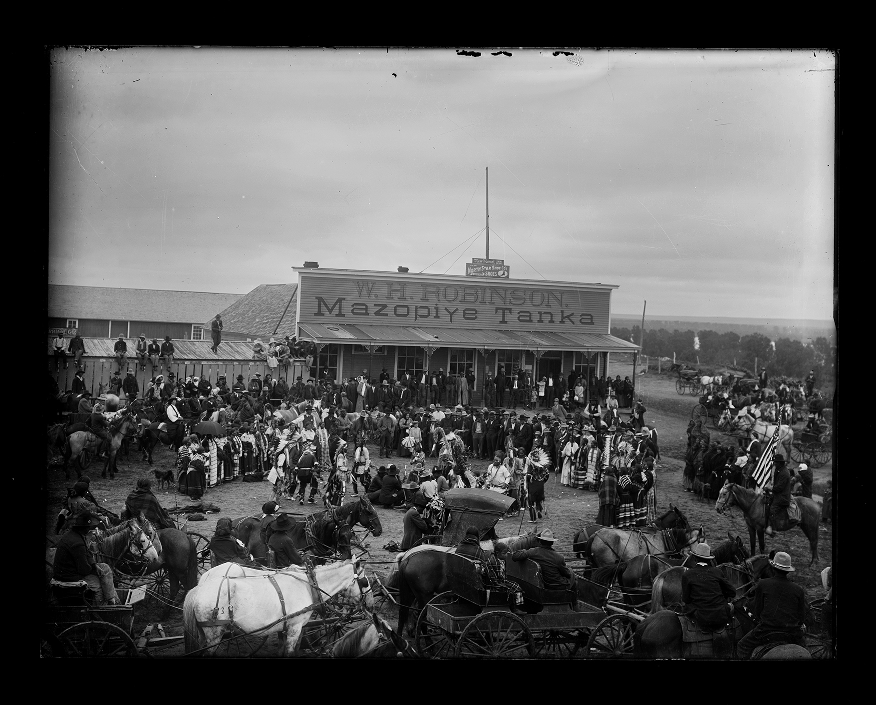 Title: Dance in front of the "Big Store" W. H. Robinson Mazopiye Tanka Store, Fort Yates (N.D.)