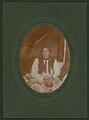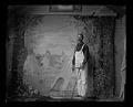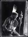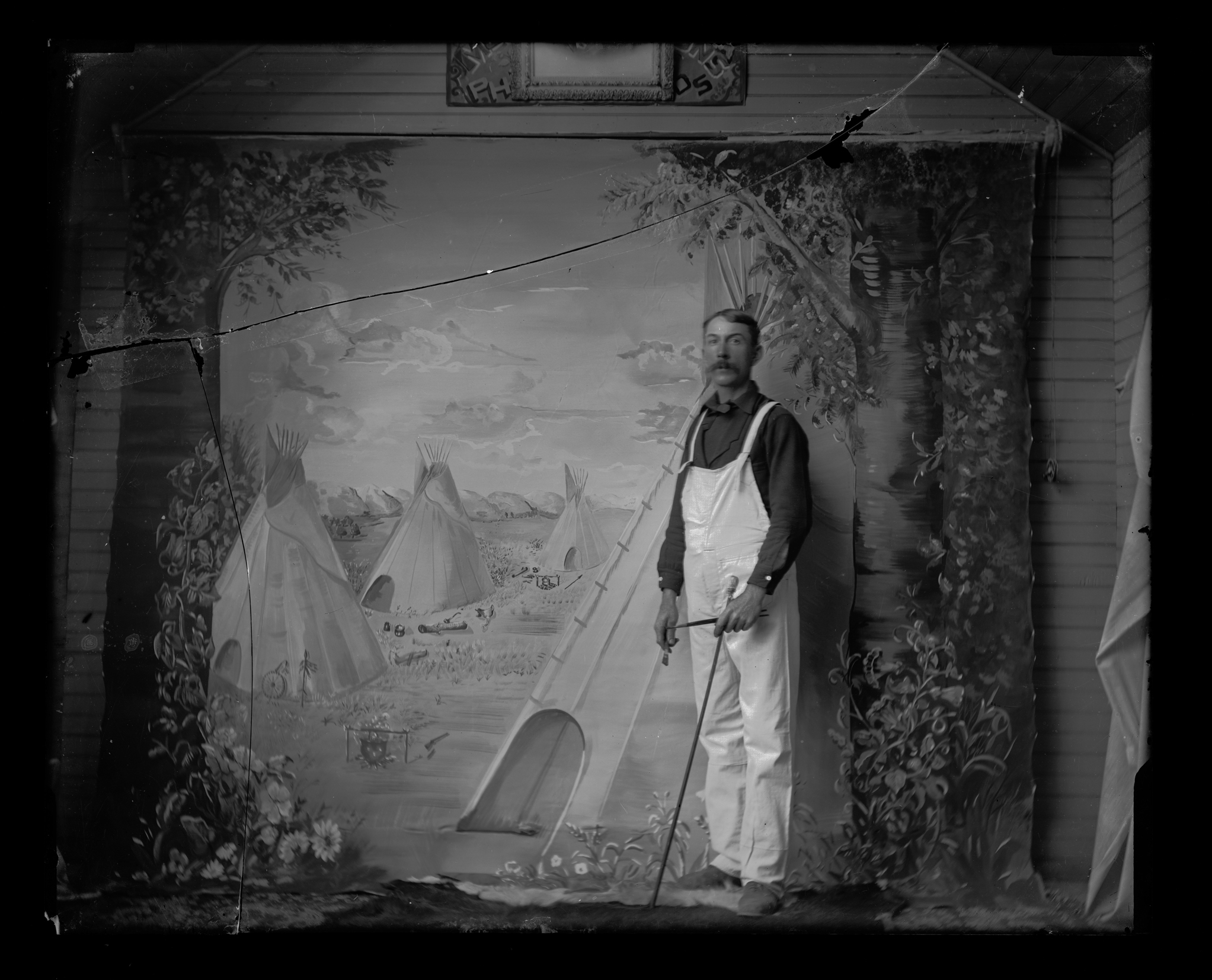 Title: George Fiske holding paint brushes and mahl stick in front of backdrop