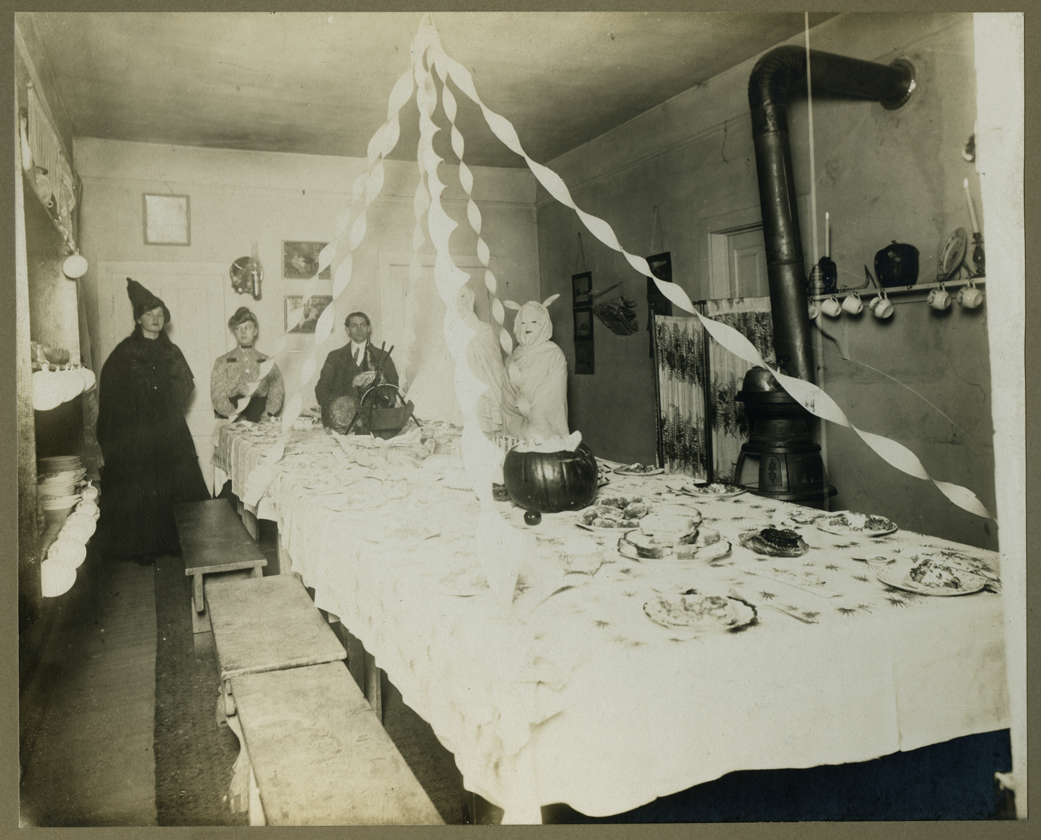 Title: Costumed group with decorated table for Halloween party, Fort Yates (N.D)
