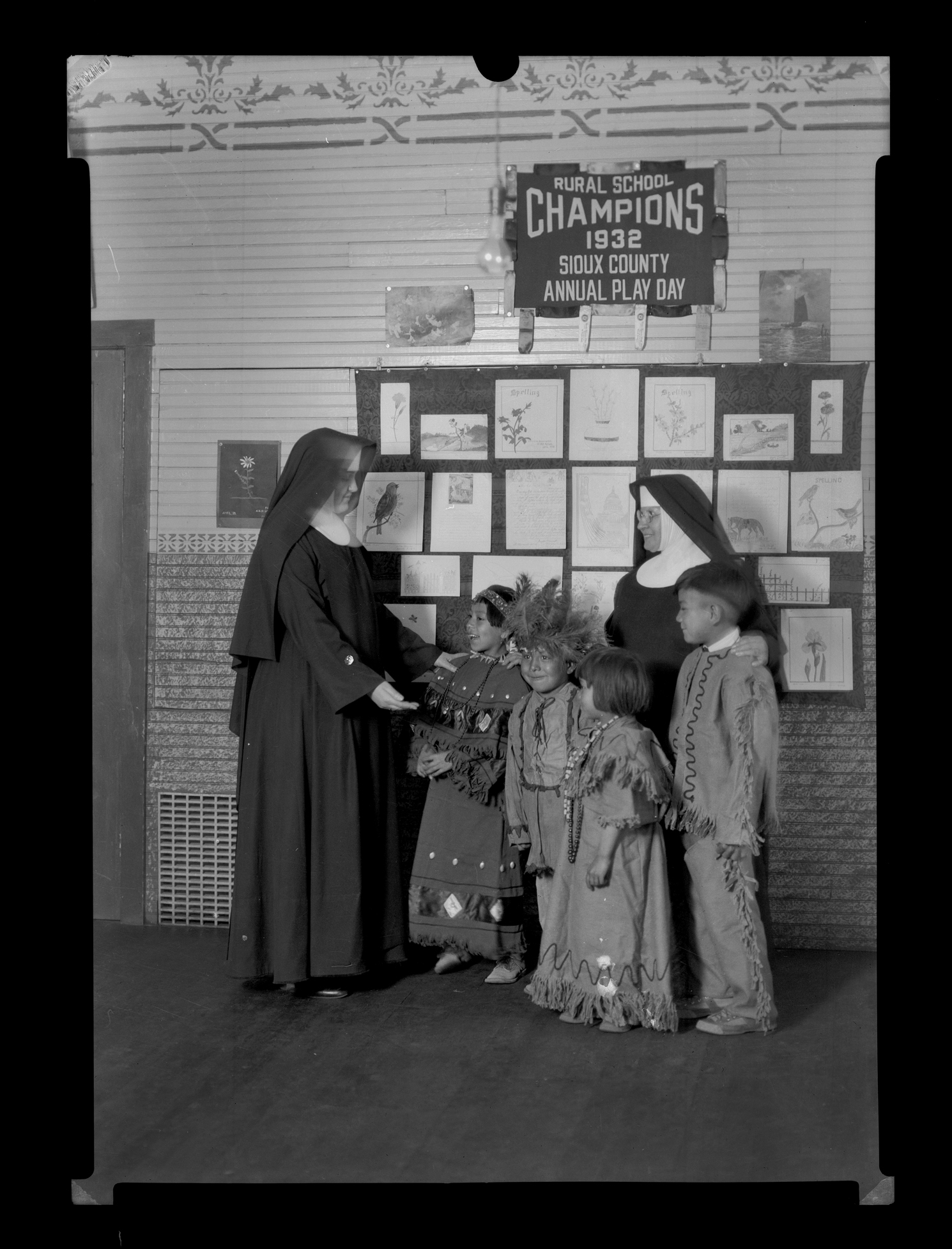 Title: Sister Seraphine with children, Sioux County Rural School Play Day