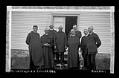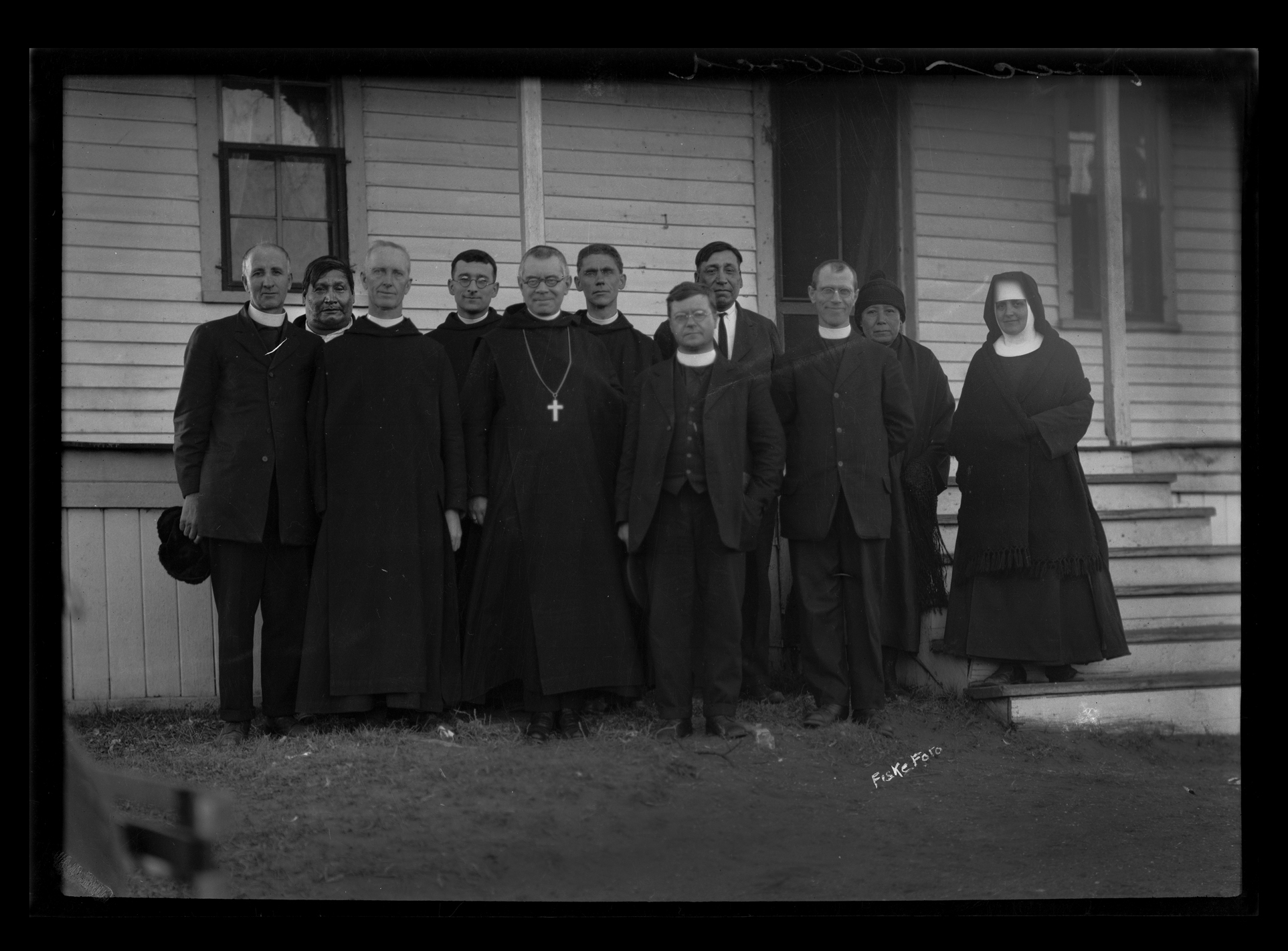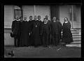 Title: Priests and a nun in a group next to a building