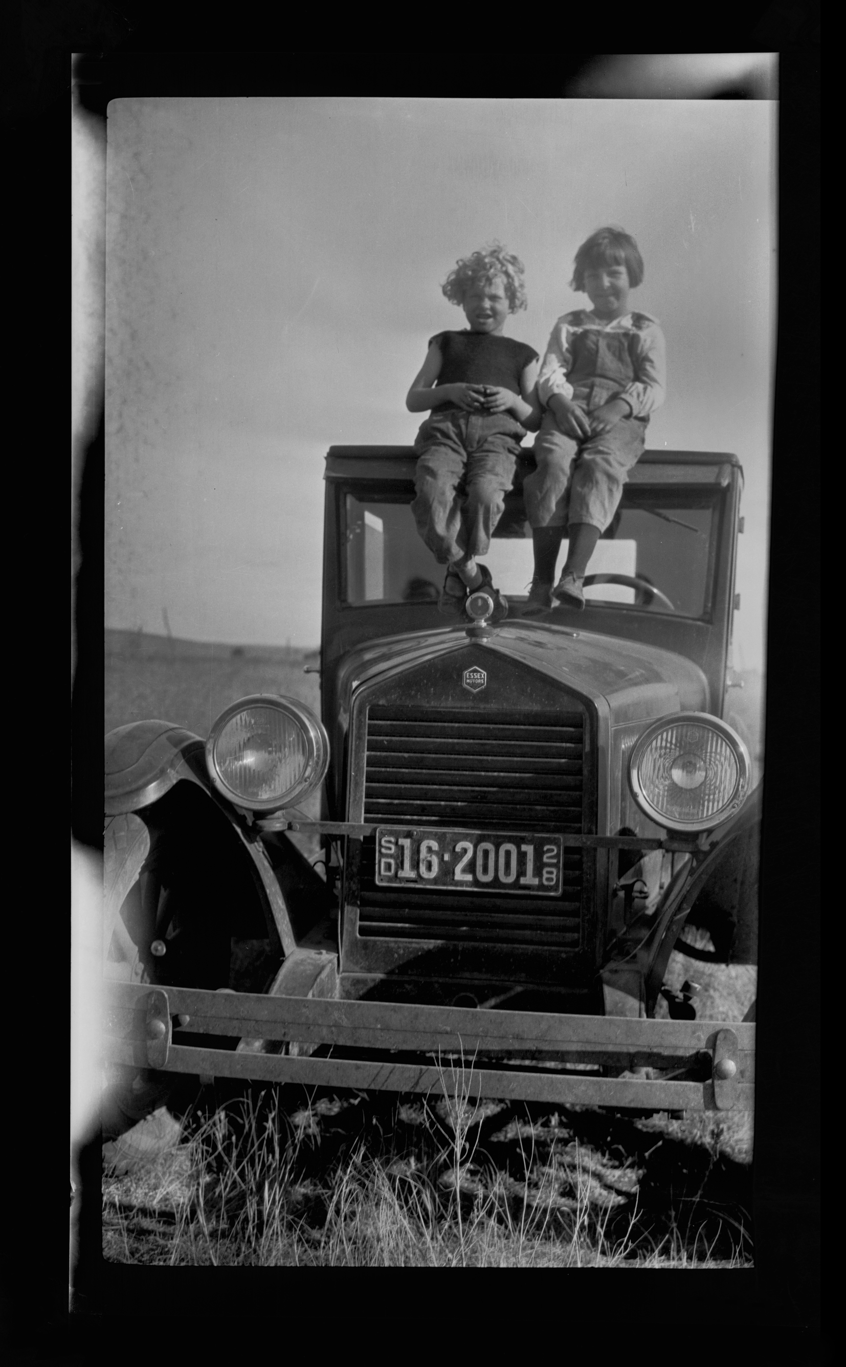 Title: Joyce Nicksic and Francine Fiske seated on roof of Essex Motor car