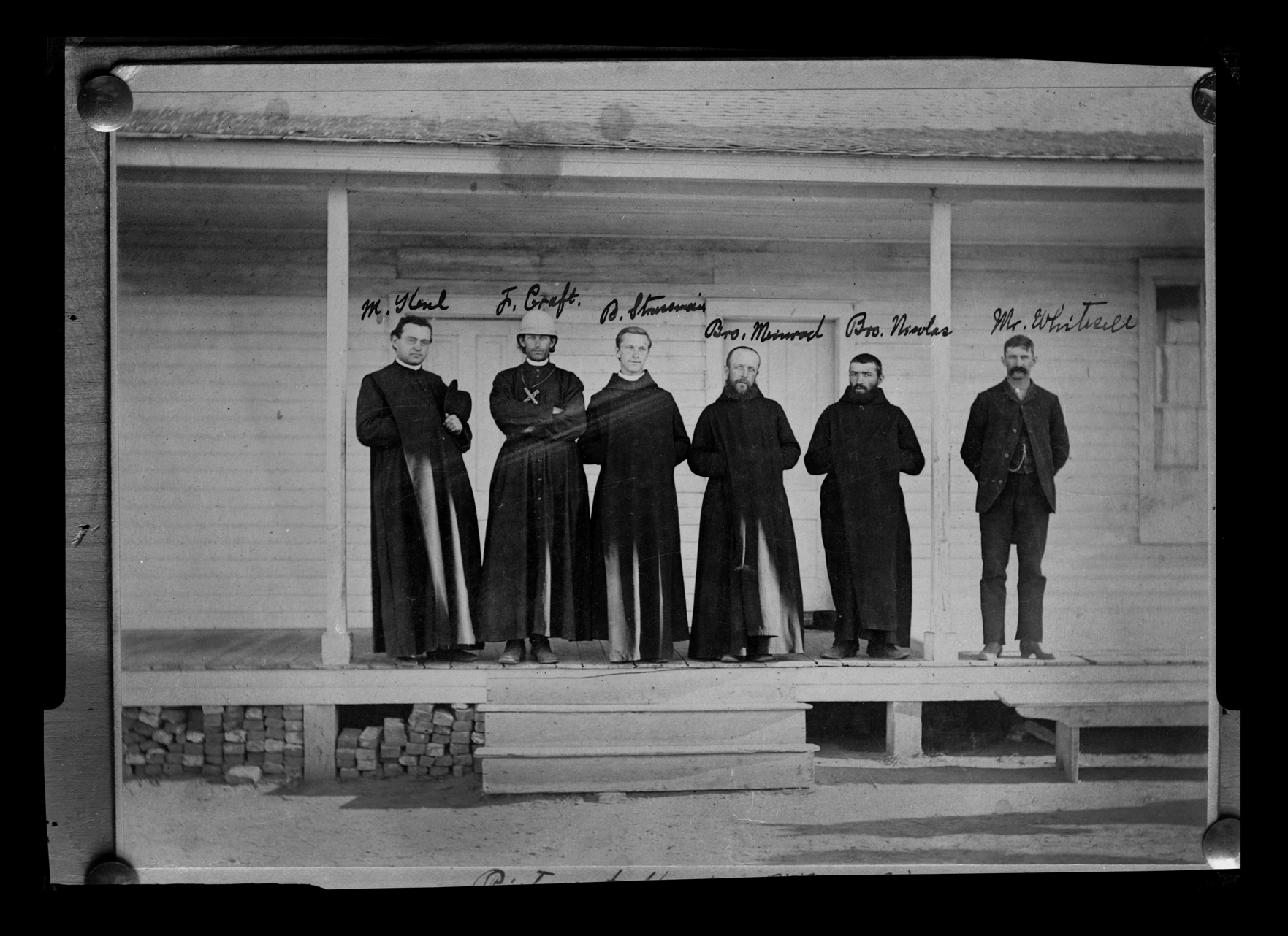 Title: Father Martin Kenel, Father Francis M. J. Craft, Father Bernard Strassmaier, Brother Meinrad Widmer, Brother Johann Nicholas Enz, William Whitesell at the agricultural boarding school at Standing Rock Indian Agency, Fort Yates (N.D.)
