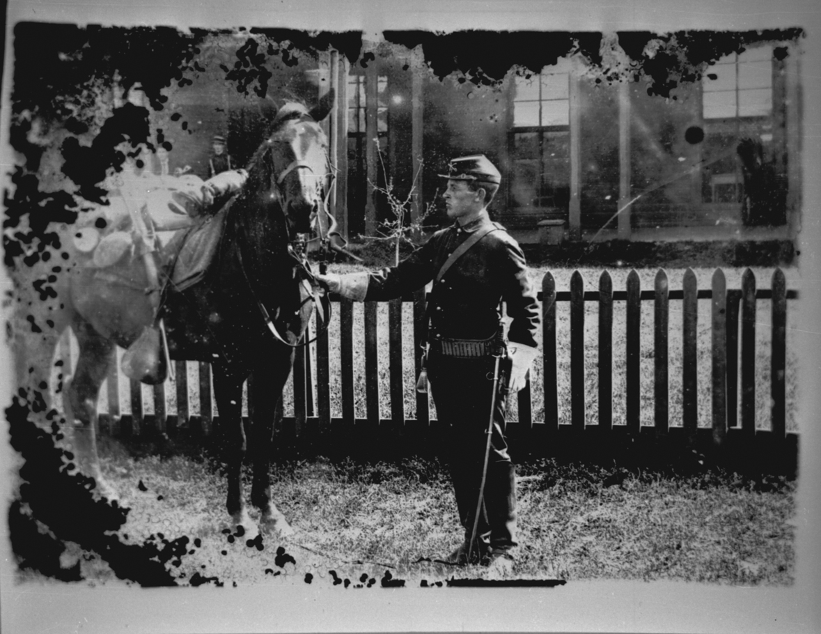 Title: Cavalryman holding horse, Fort Yates (D.T.)
