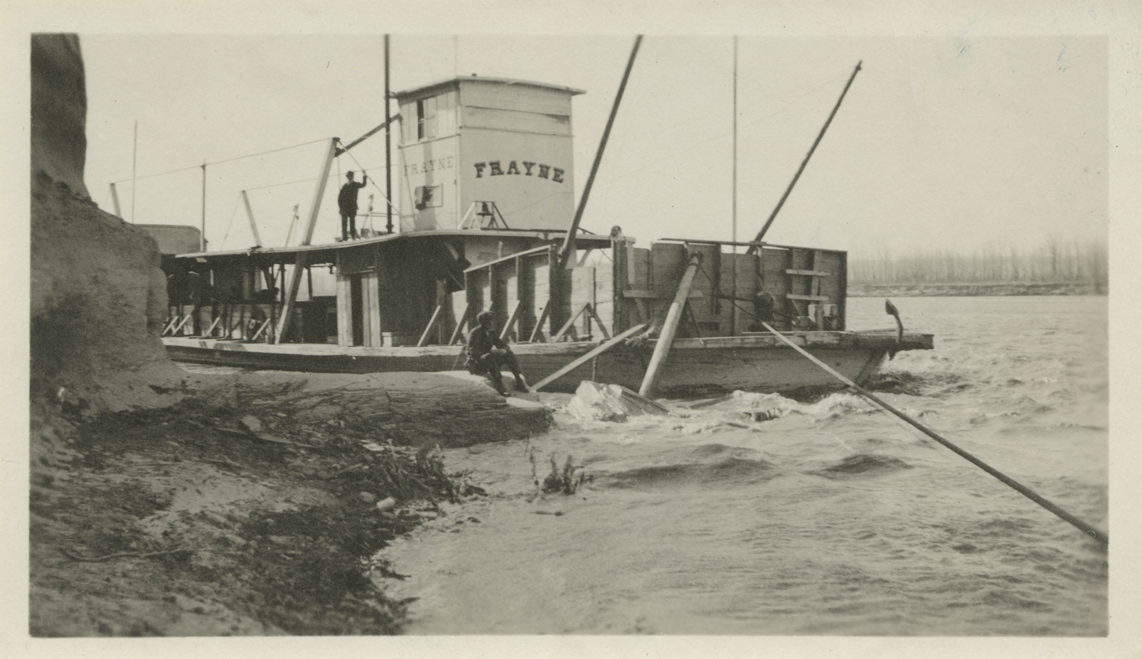 Title: Motor vessel Frayne tied up to rock outcropping at river's edge