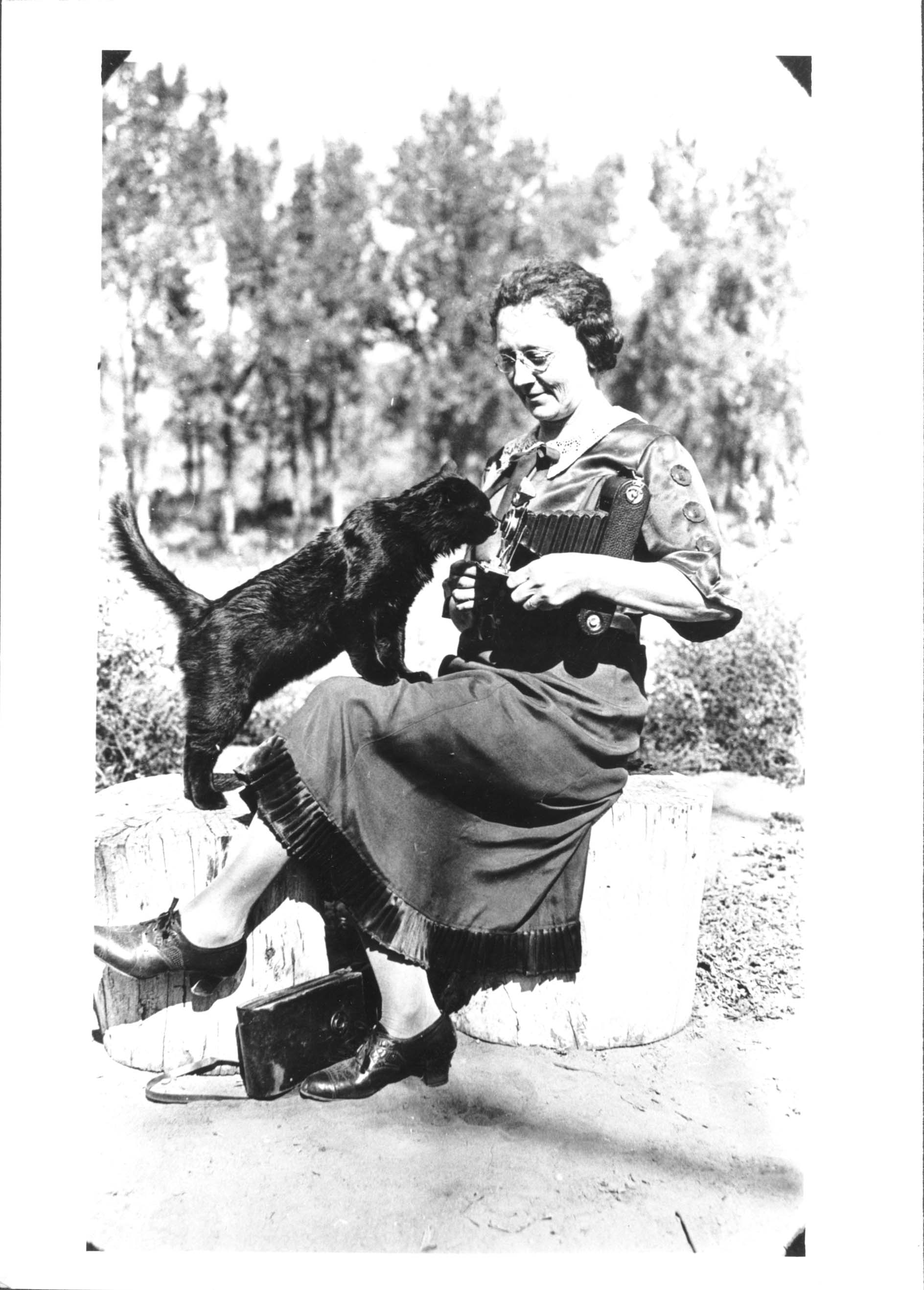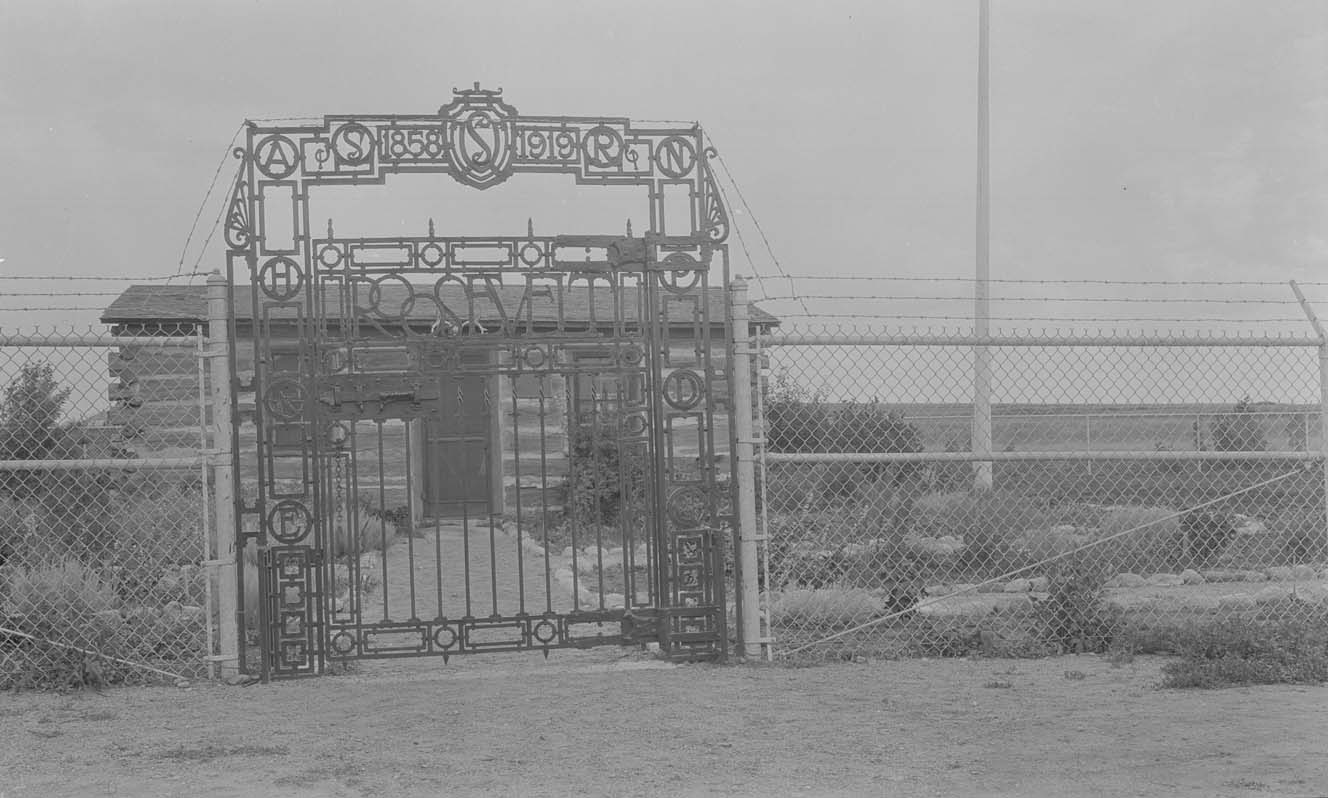 Woman in front of Theodore Roosevelt log cabin on the State Capital Grounds Bismarck ND