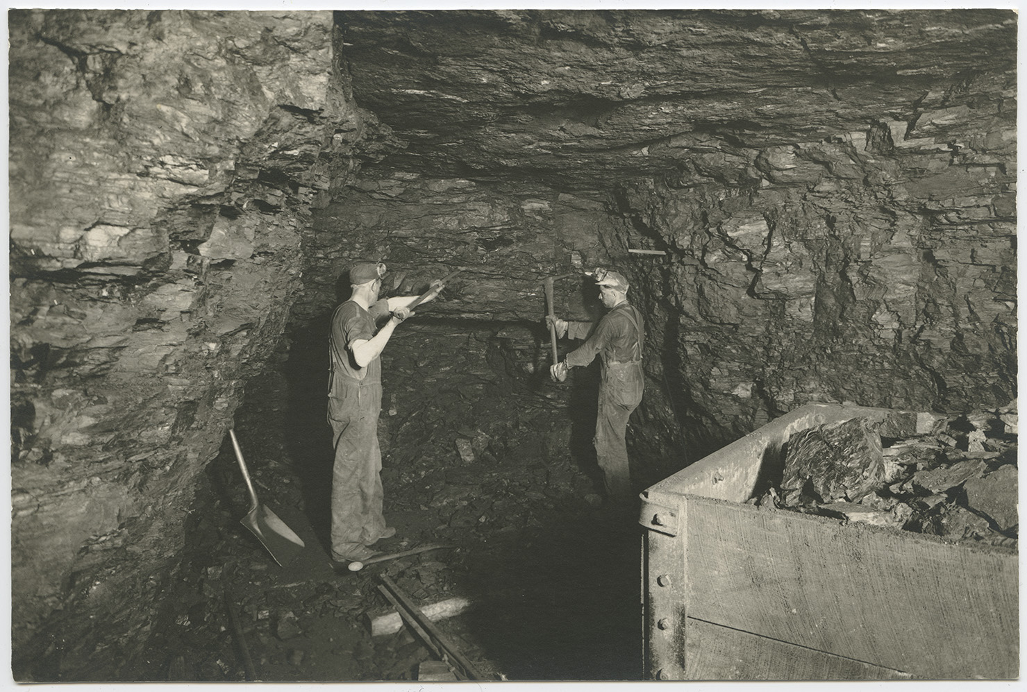 Title: Digging coal with pick ax and shovel at face of vein, Washburn Lignite Coal Company, Wilton (N.D.)