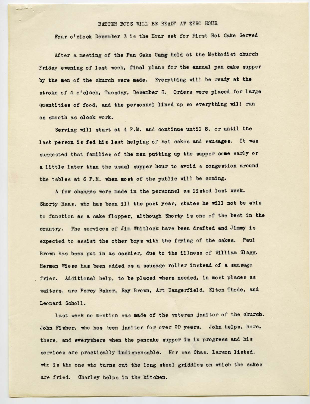 Title: Typed news clipping, "1940 Pancake Supper is Now Past History," Washburn Leader, McLean County, North Dakota