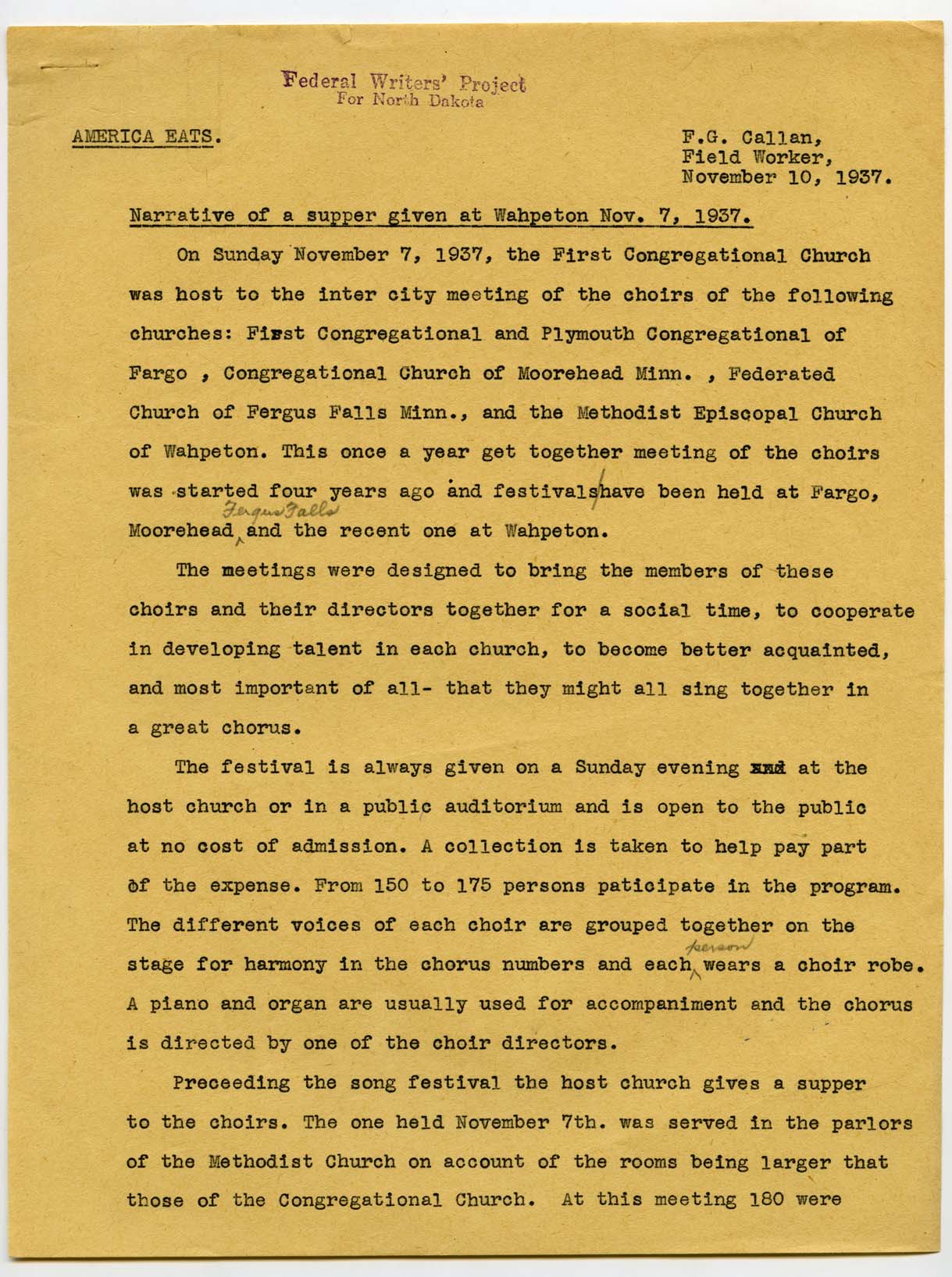 Title: Draft essay, "Narrative of a supper given at Wahpeton Nov. 7, 1937," Richland County, North Dakota, by F. G. Callan