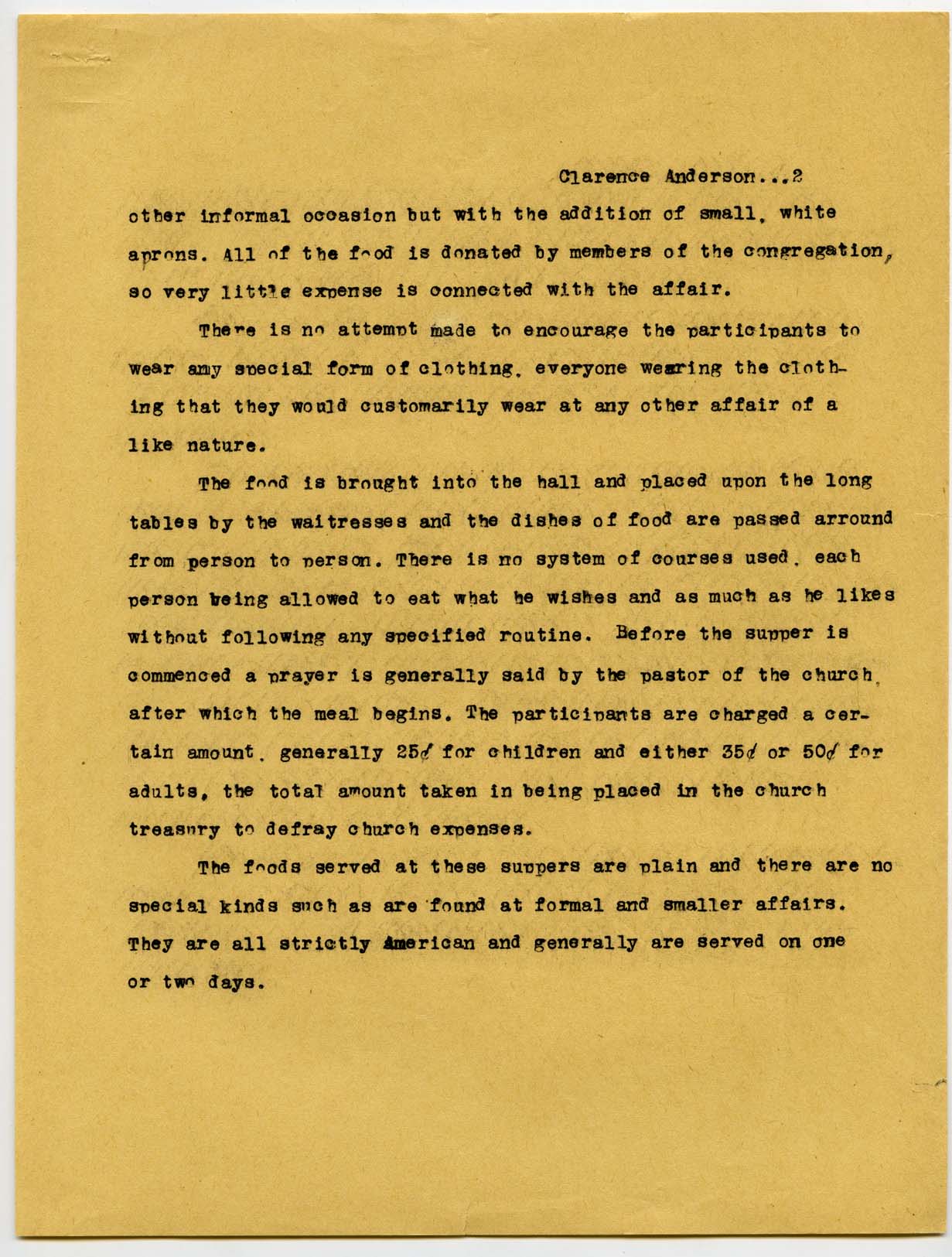 Title: Draft essay about typical meals in Traill County, North Dakota, by Clarence Anderson