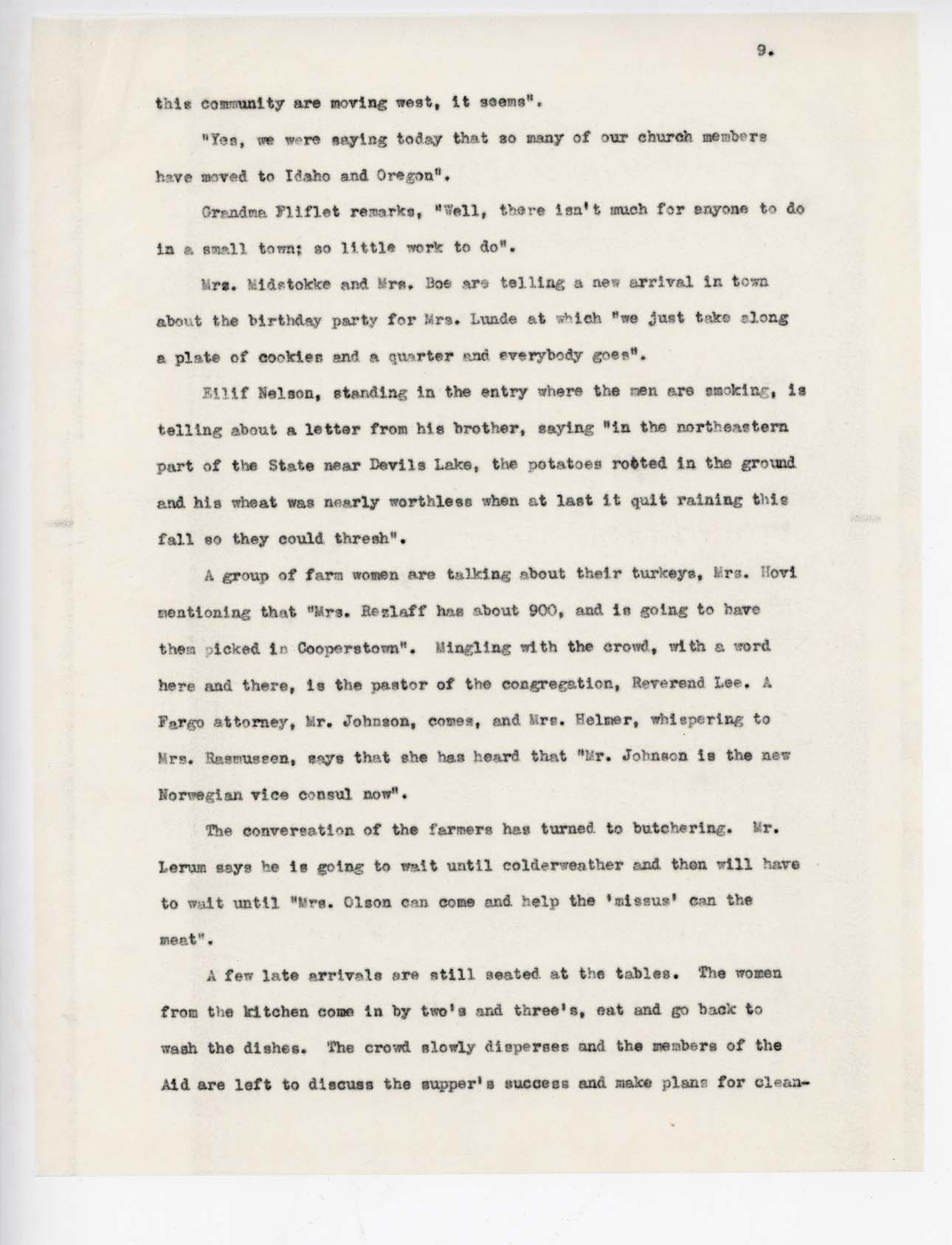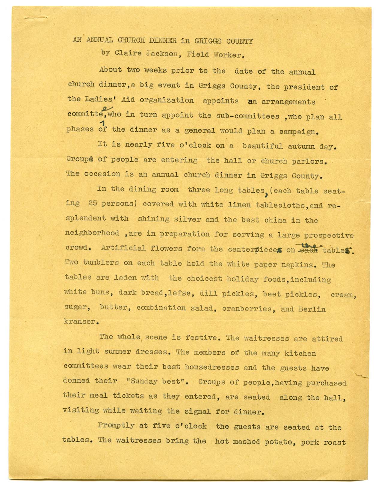 Title: Draft essay about an annual church dinner in Griggs County, North Dakota, by Claire Jackson