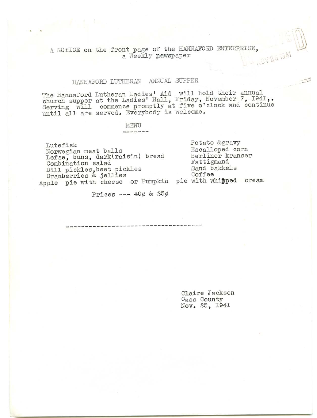 Title: Typed news clipping, "Hannaford Lutheran Annual Supper," Cass County, North Dakota, typed by Claire Jackson