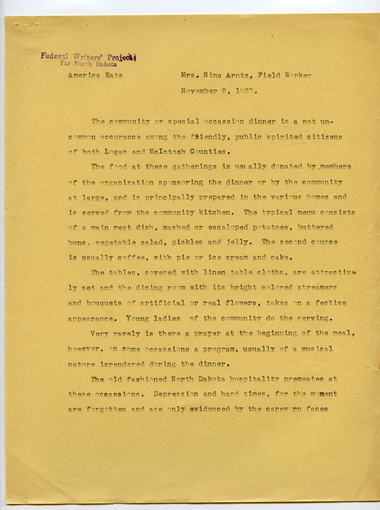 Collection: 30561 - Historical Society. North Dakota Writers' Project. America Eats Files.
