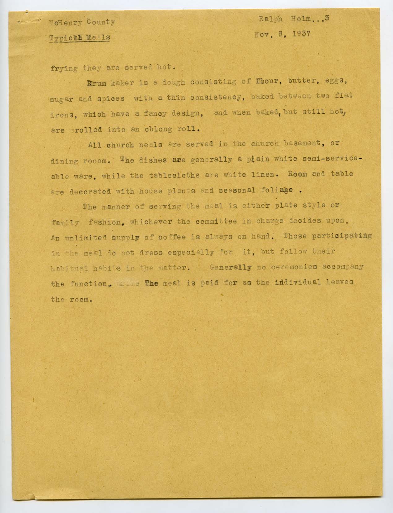 Title: Draft essay about typical meals in McHenry County, North Dakota, by Ralph Holm
