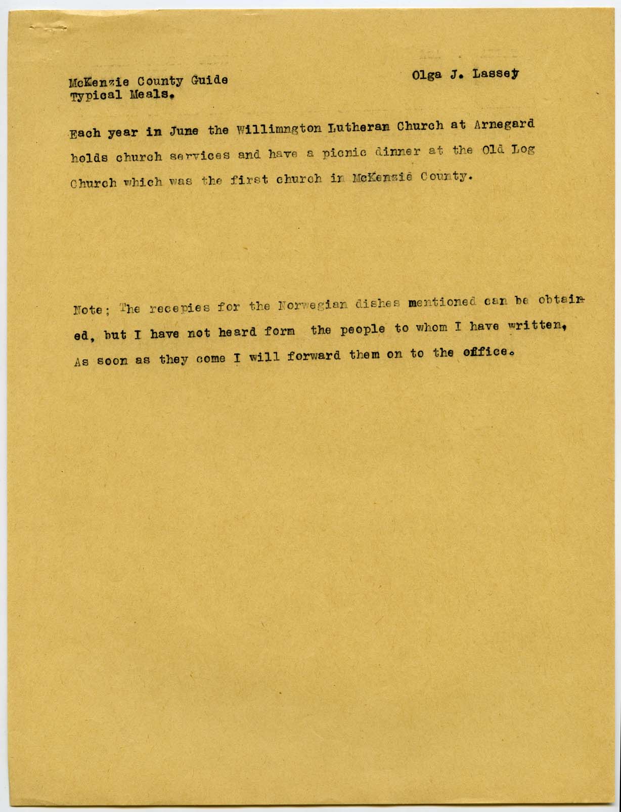 Title: Draft essay about typical meals in McKenzie County, North Dakota, by Olga J. Lassey