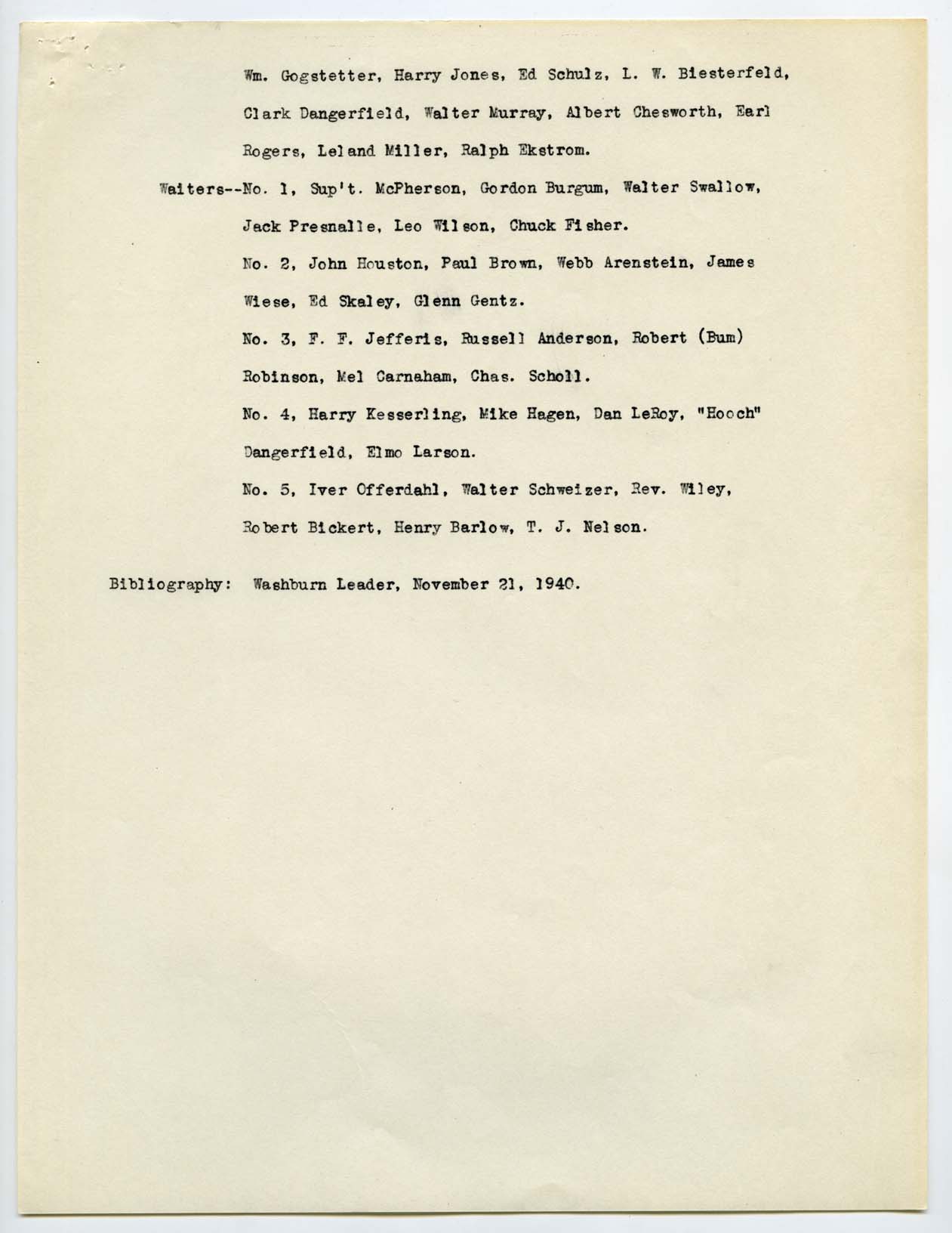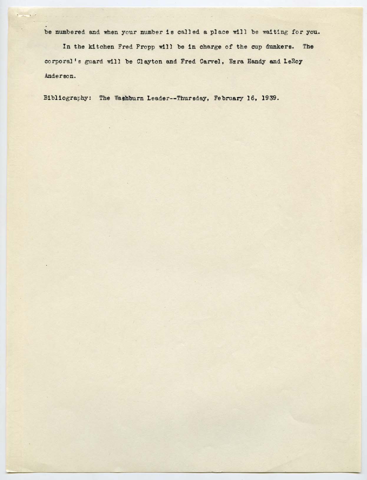 Title: Typed news clipping, "Waffles Enjoyed by Town Folks," Washburn Leader, McLean County, North Dakota