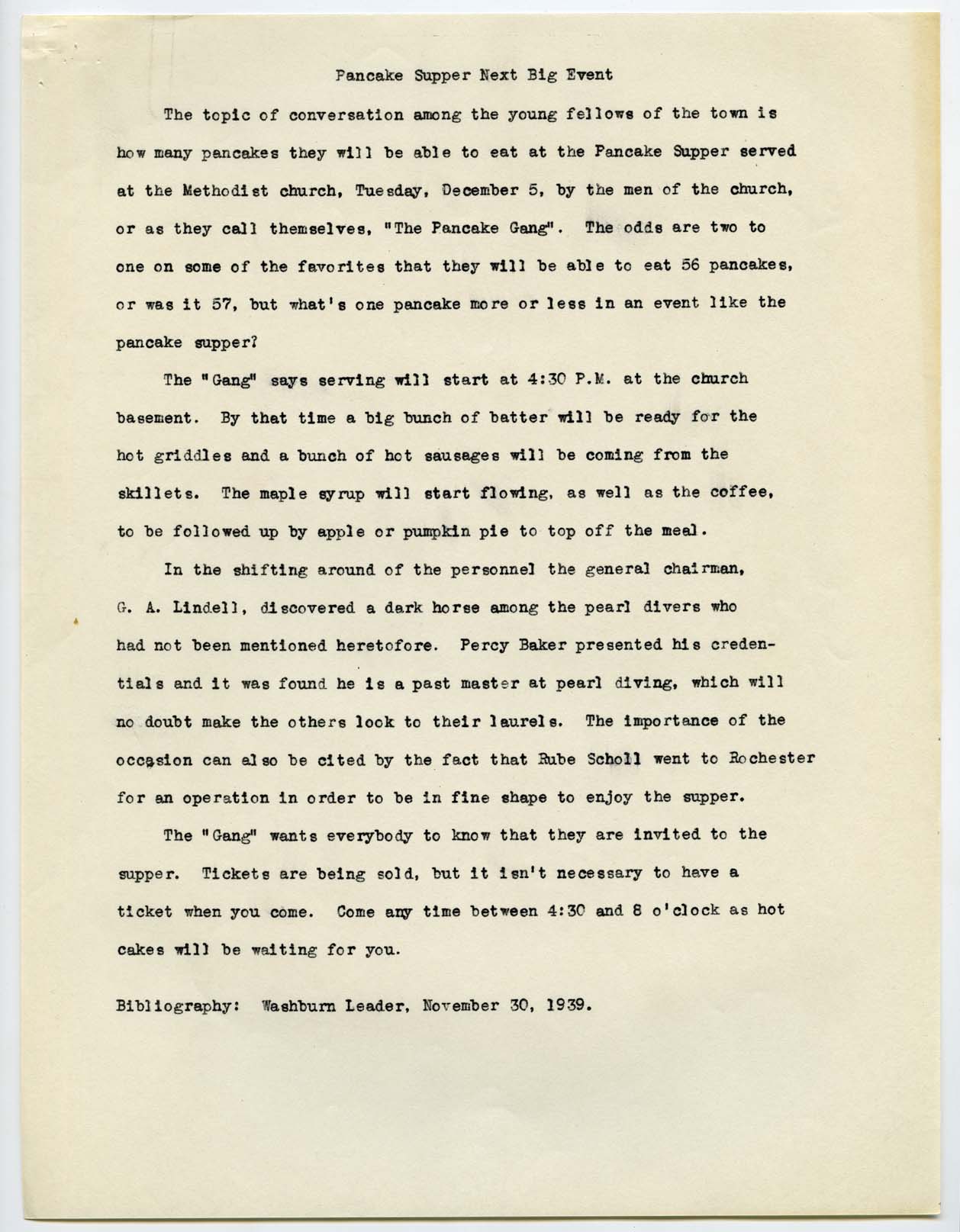 Title: Typed news clipping, "Pancake Supper Date Set for December 3," Washburn Leader, McLean County, North Dakota