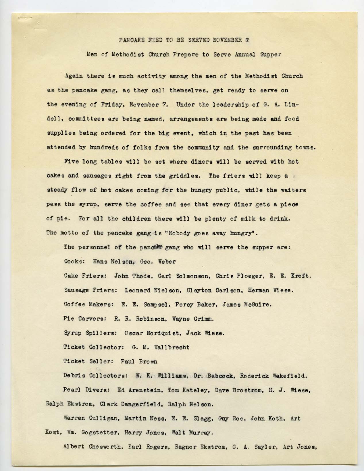 Title: Typed news clipping, "Pancake Feed to be Served November 7" publication unknown, publication date unknown