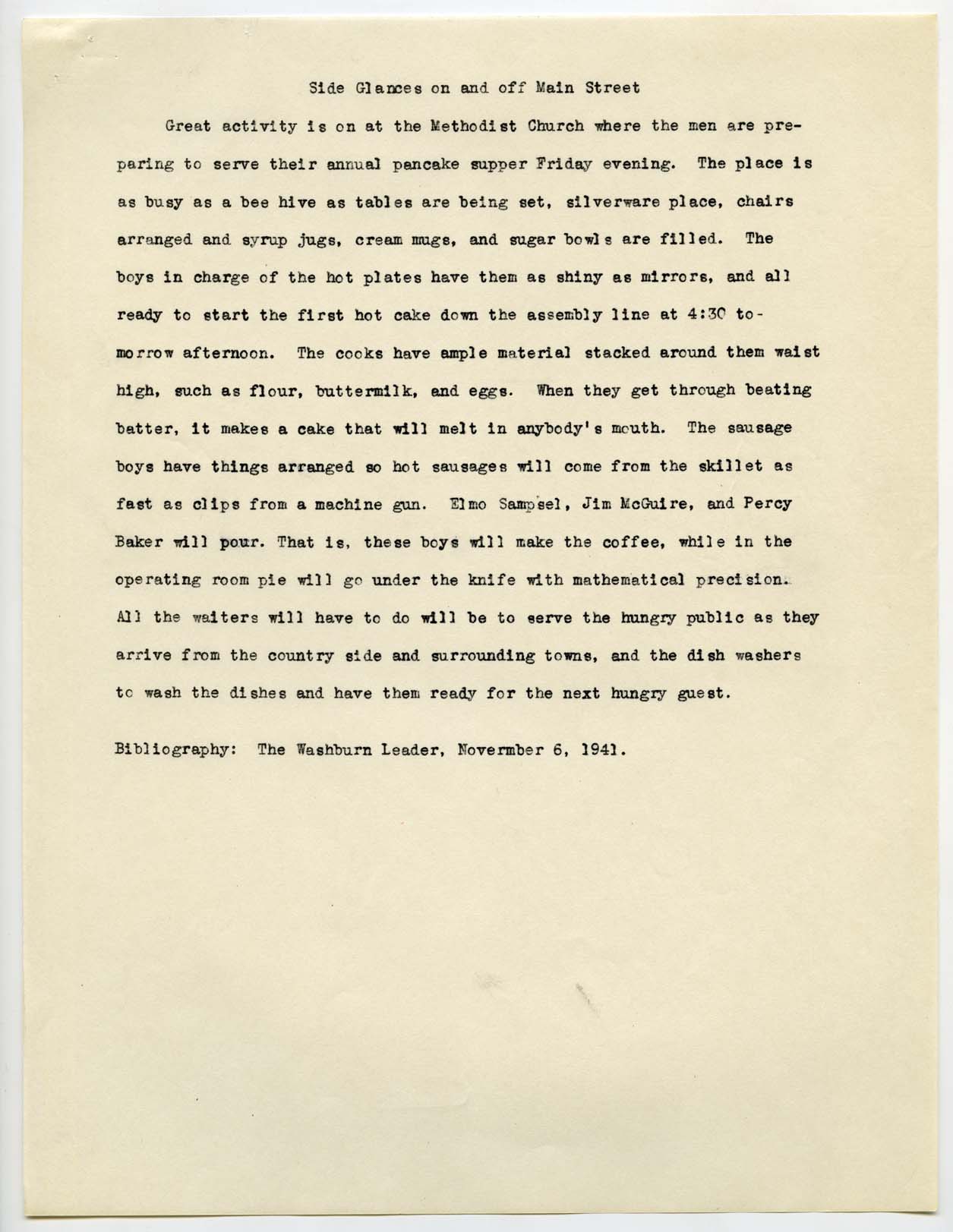 Title: Typed news clipping, "Side Glances On and Off Main Street," Washburn Leader, McLean County, North Dakota