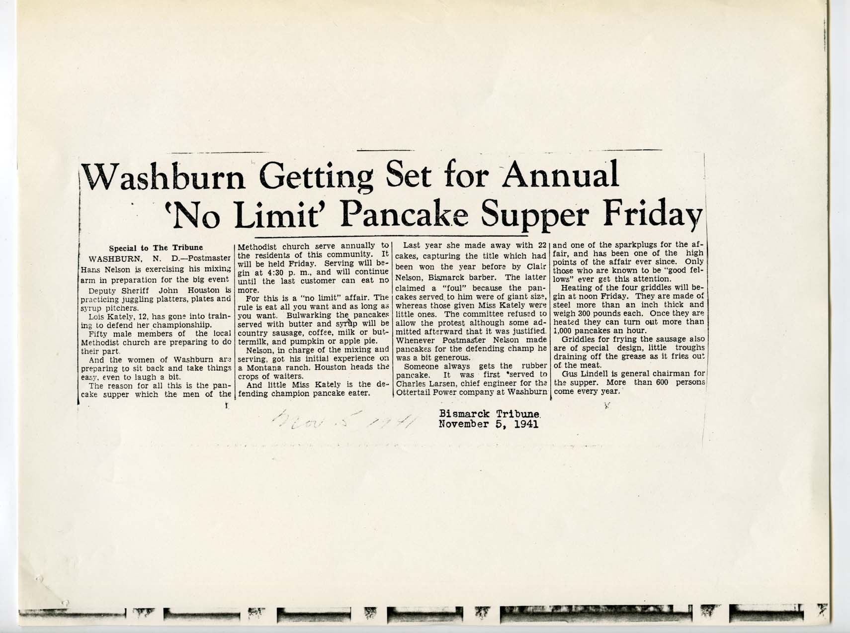 Title: News clipping, "Washburn Getting Set for Annual 'No Limit' Pancake Supper Friday," Bismarck Tribune, Burleigh County, North Dakota