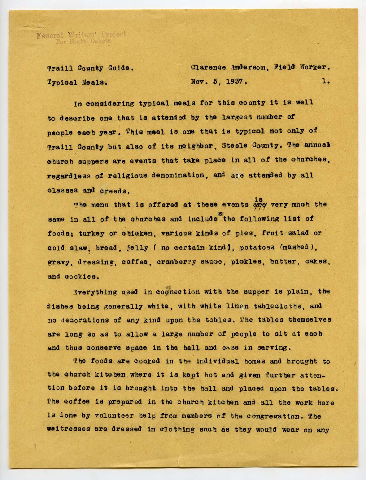 Title: Draft essay about typical meals in Traill County, North Dakota, by Clarence Anderson