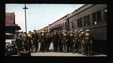 Title: Men with canes beside train, possibly students from the School for the Blind, ca. 1934