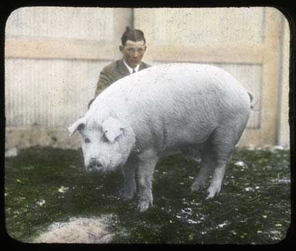 Title: Lucien Barns with Champion Barrow, purchased by a farmer for $141.20, Northwest Fair, Minot (ND), ca. 1934